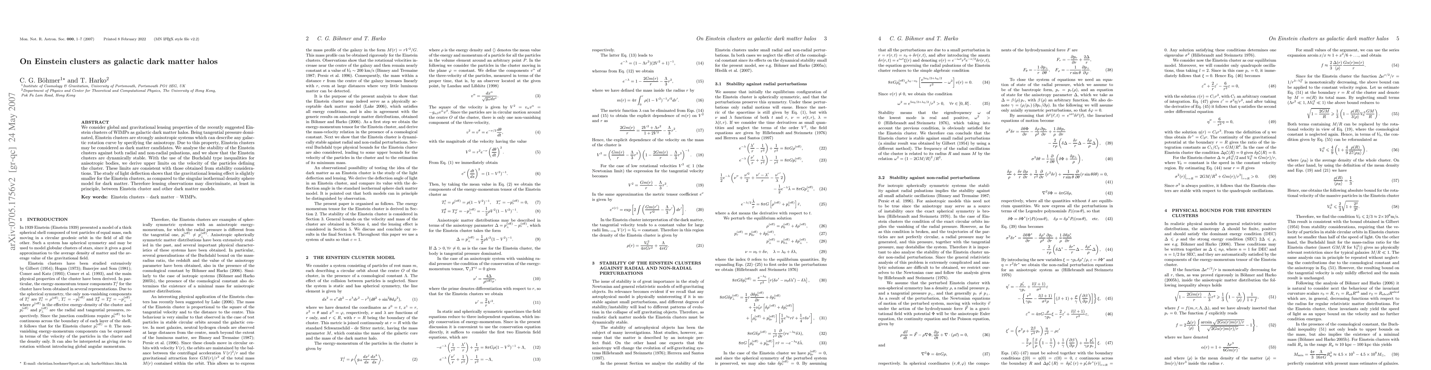 This paper explores Einstein clusters of Weakly Interacting Massive Particles (WIMPs) as potential galactic dark matter halos, demonstrating their ability to explain galactic rotation curves through strong anisotropy. The study confirms the dynamical stability of these clusters and finds that their gravitational lensing effect is slightly less than that of the singular isothermal density sphere model, suggesting potential observational differences to distinguish them from other dark matter models.