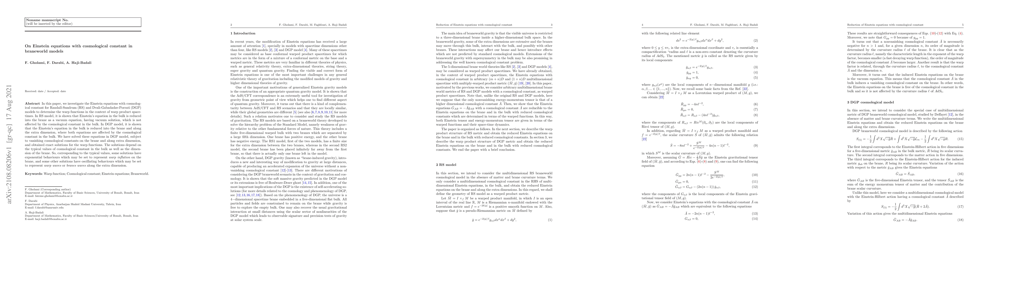 Researchers investigated Einstein equations with cosmological constant in Randall-Sundrum and Dvali-Gabadadze-Porrati models, finding that the equations reduce to vacuum or brane equations depending on the model, leading to solutions for warp functions that may represent inflation or waves.