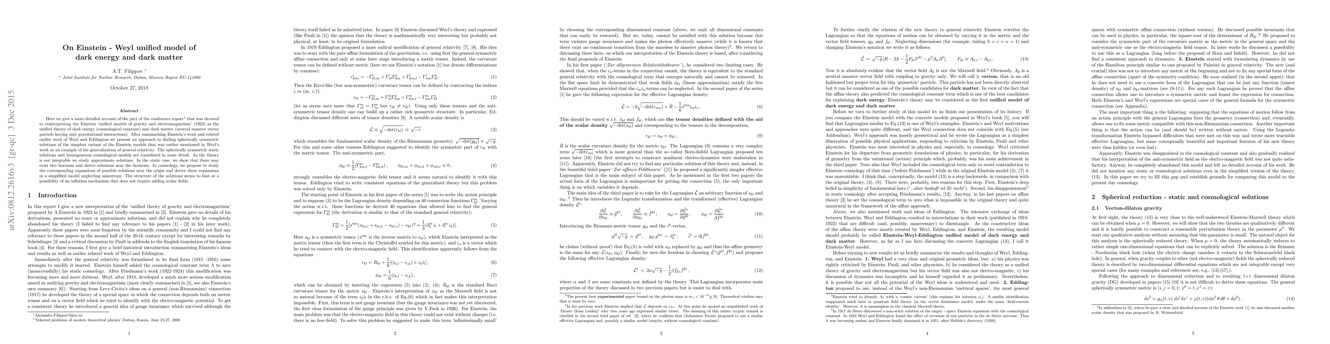 Here we give a more detailed account of the part of the conference report that was devoted to reinterpreting the Einstein `unified models of gravity and electromagnetism' (1923) as the unified theory of dark energy (cosmological constant) and dark matter (neutral massive vector particle having only gravitational interactions). After summarizing Einstein's work and related earlier work of Weyl and Eddington, we present an approach to finding spherically symmetric solutions of the simplest variant of the Einstein models that was earlier mentioned in Weyl's work as an example of his generalization of general relativity. The spherically symmetric static solutions and homogeneous cosmological models are considered in some detail. As the theory is not integrable we study approximate solutions. In the static case, we show that there may exist two horizons and derive solutions near the horizons. In cosmology, we propose to study the corresponding expansions of possible solutions near the origin and derive these expansions in a simplified model neglecting anisotropy. The structure of the solutions seems to hint at a possibility of an inflation mechanism that does not require adding scalar fields.