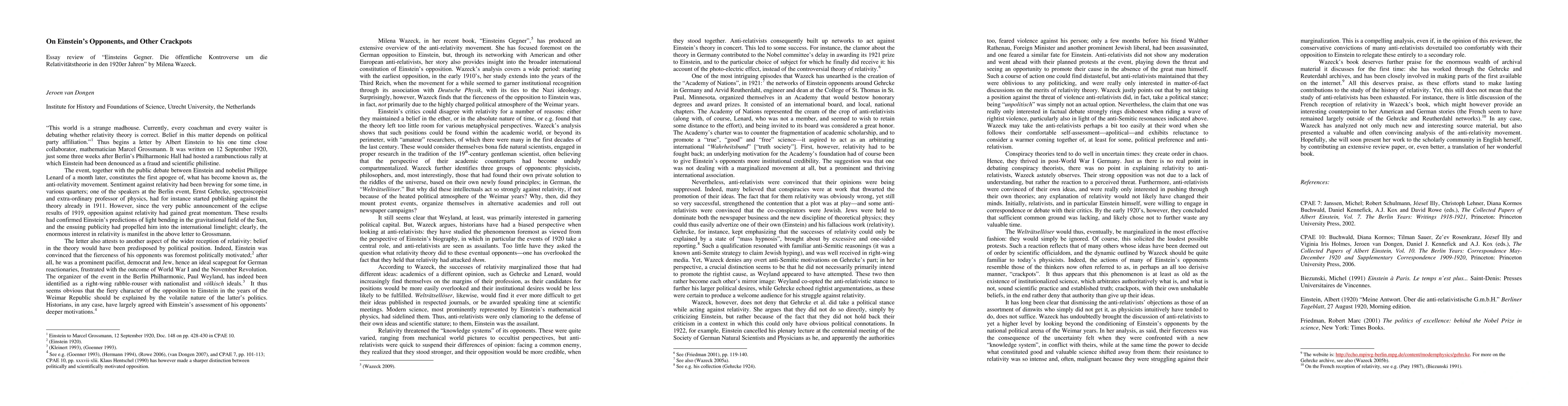Essay Review of "Einsteins Gegner. Die \"offentliche Kontroverse um die Relativit\"atstheorie in den 1920er Jahren" by Milena Wazeck.