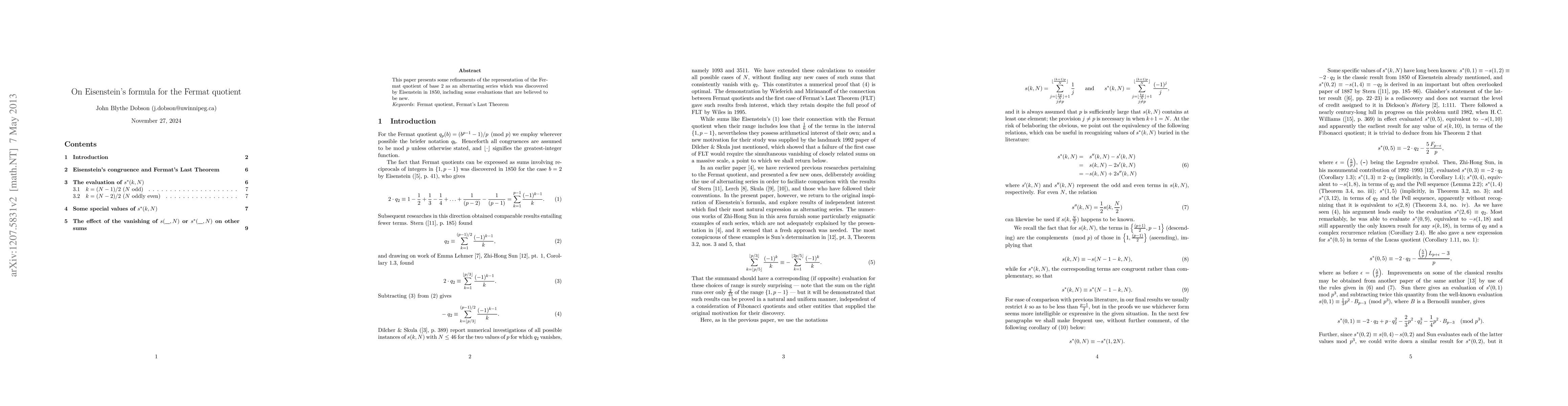 This paper presents some refinements of the representation of the Fermat quotient of base 2 as an alternating series which was discovered by Eisenstein in 1850, including some evaluations that are believed to be new.