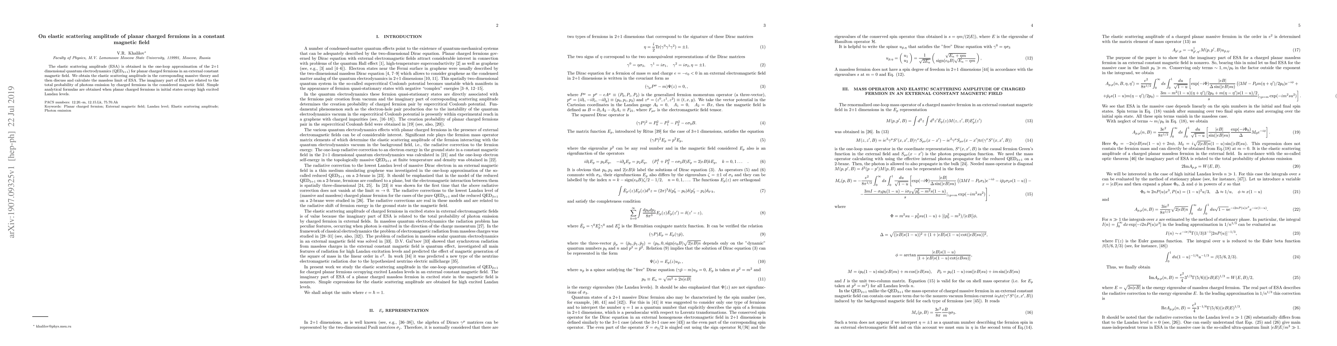 This paper calculates the elastic scattering amplitude for planar charged fermions in a 2+1 dimensional QED framework under a constant magnetic field, focusing on both massive and massless limits. It provides analytical formulas for high excited Landau levels and links the imaginary part of the amplitude to photon emission probabilities.