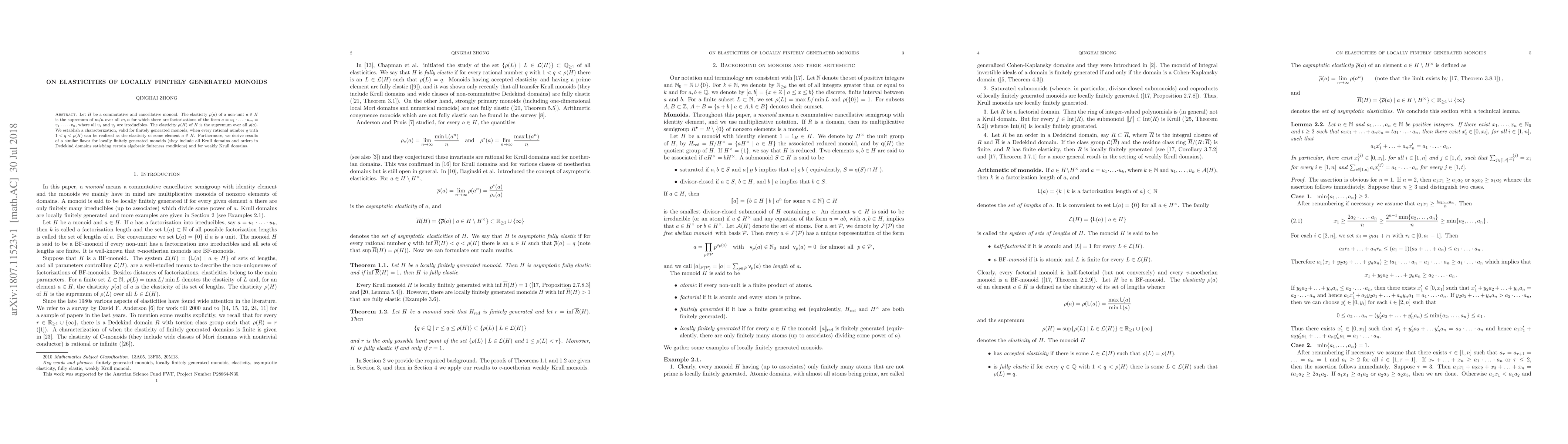 This paper characterizes the elasticity of locally finitely generated monoids, specifically focusing on when every rational number between 1 and the elasticity of the monoid can be realized as the elasticity of some element within it. It extends these results to include locally finitely generated monoids, Krull domains, and orders in Dedekind domains under certain algebraic conditions.