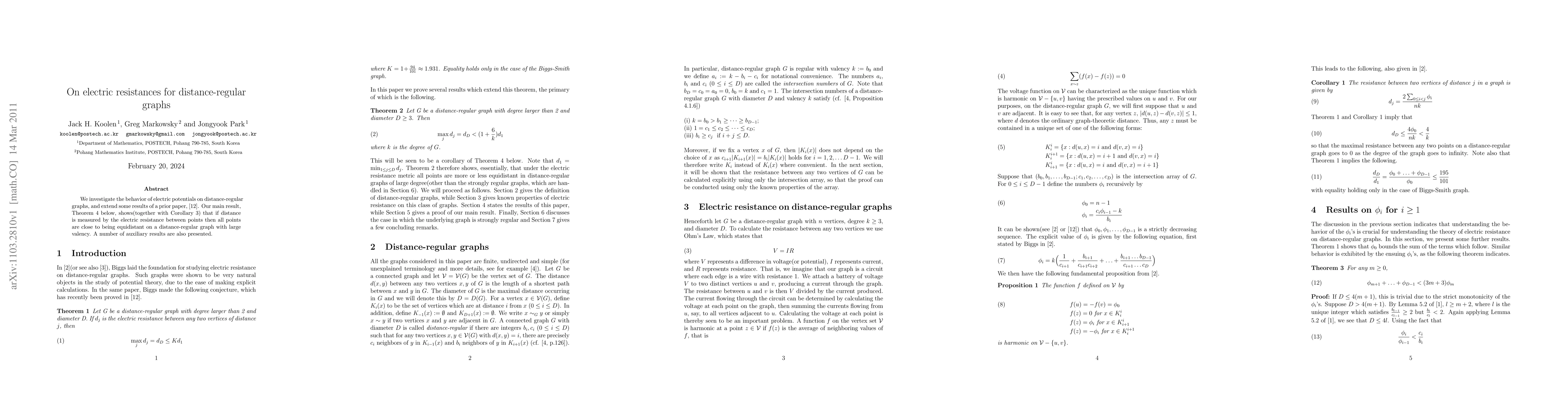 This paper explores electric potentials on distance-regular graphs and extends previous results. The main finding, Theorem 4, demonstrates that points on such graphs are nearly equidistant when distance is defined by electric resistance, particularly for graphs with large valency.