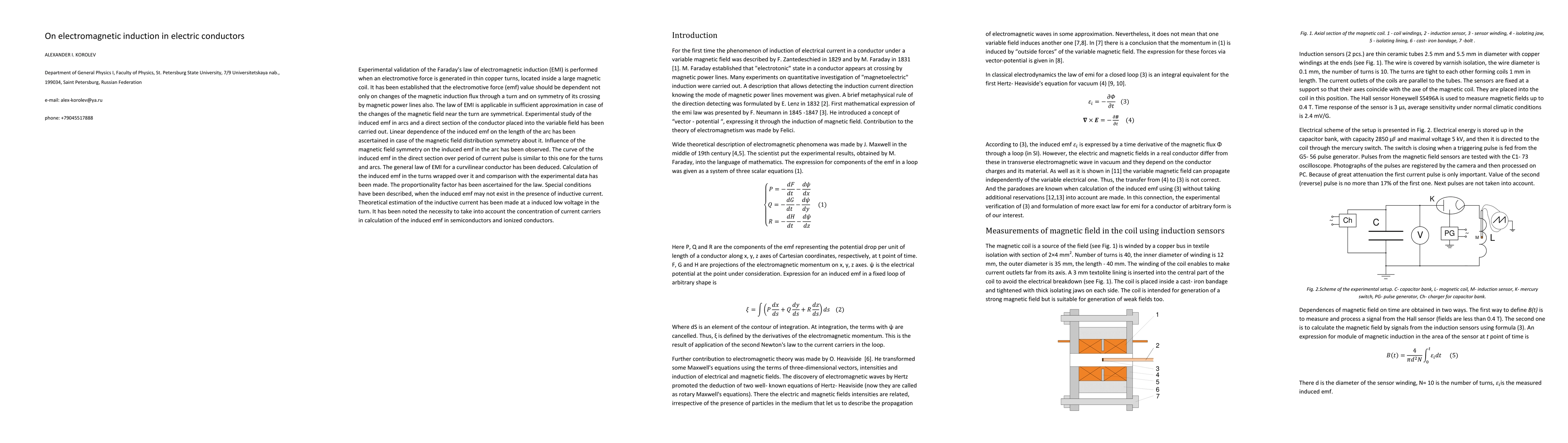 This research experimentally validates Faraday's law of electromagnetic induction. It establishes that the induced electromotive force (emf) in thin copper turns within a large magnetic coil depends on magnetic flux change, turn-magnetic field symmetry, and symmetry of magnetic field changes. The study finds a linear relationship between induced emf and arc length under symmetrical magnetic field distribution. It also deduces a general law for EMI in curvilinear conductors, calculates induced emf in wrapped turns, and discusses conditions where induced emf may not occur. The paper emphasizes the need to consider current carrier concentration in semiconductors and ionized conductors when calculating induced emf.