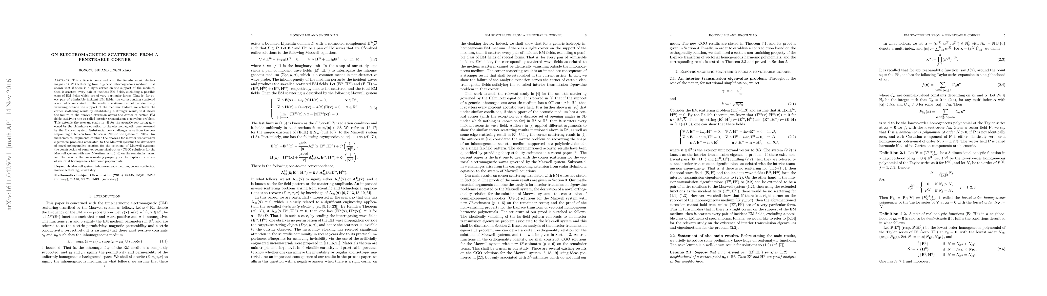This article is concerned with the time-harmonic electromagnetic (EM) scattering from a generic inhomogeneous medium. It is shown that if there is a right corner on the support of the medium, then it scatters every pair of incident EM fields, excluding a possible class of EM fields which are of very particular forms. That is, for every pair of admissible incident EM fields, the corresponding scattered wave fields associated to the medium scatterer cannot be identically vanishing outside the support of the medium. Indeed, we achieve the corner scattering result by establishing a stronger result, that shows the failure of the analytic extension across the corner of certain EM fields satisfying the so-called interior transmission eigenvalue problem. This extends the relevant study in [3] for the acoustic scattering governed by the Helmholtz equation to the electromagnetic case governed by the Maxwell system. Substantial new challenges arise from the corresponding extension from the scalar PDE to the system of PDEs. Our mathematical arguments combine the analysis for interior transmission eigenvalue problems associated to the Maxwell system; the derivation of novel orthogonality relation for the solutions of Maxwell systems; the construction of complex-geometrical-optics (CGO) solutions for the Maxwell system with new Lp-estimates (p > 6) on the remainder terms; and the proof of the non-vanishing property for the Laplace transform of vectorial homogeneous harmonic polynomials.