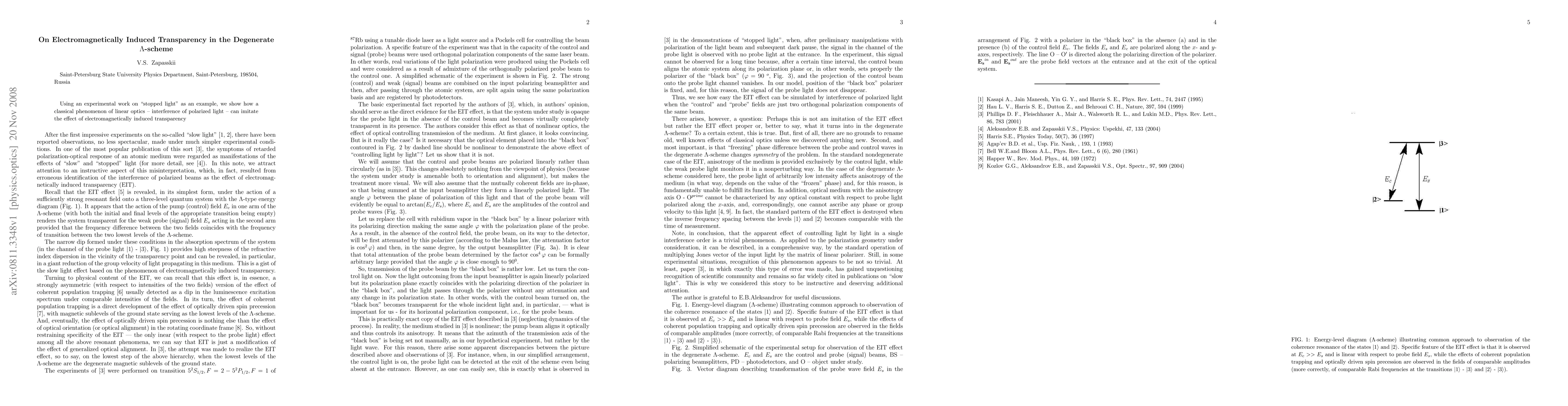 Summary: This paper demonstrates how the phenomenon of electromagnetically induced transparency can be mimicked in a degenerate Λ-scheme through the interference of polarized light, using "stopped light" experiments as an illustrative example. The study highlights the classical optics analogy to quantum interference effects.
