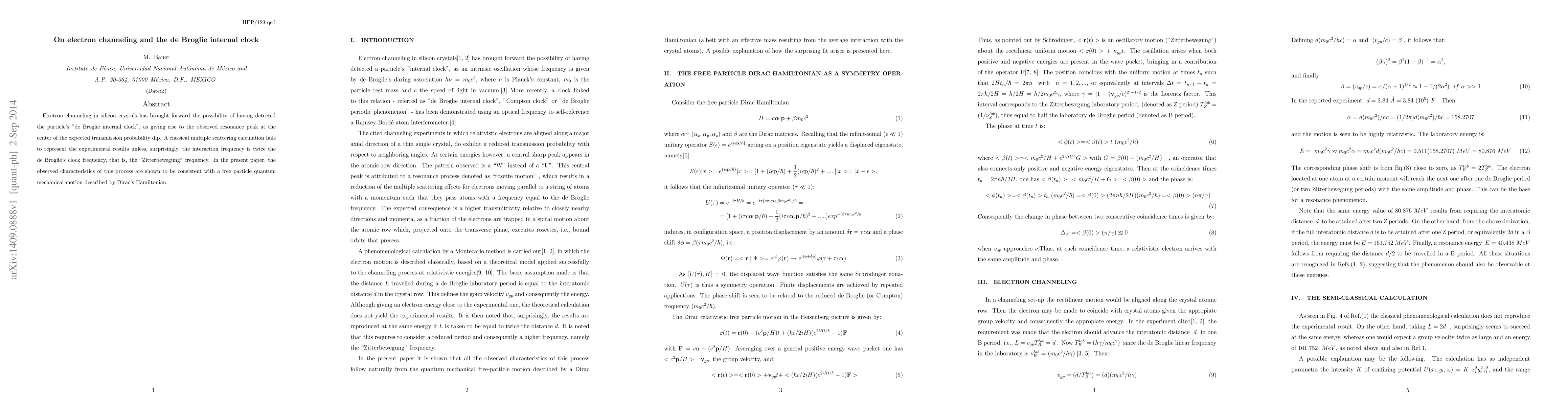 This paper investigates electron channeling in silicon crystals, revealing a resonance peak linked to the electron's "de Broglie internal clock," specifically the "Zitterbewegung" frequency. The observed phenomena align with quantum mechanical motion described by Dirac's Hamiltonian, challenging classical multiple scattering models.