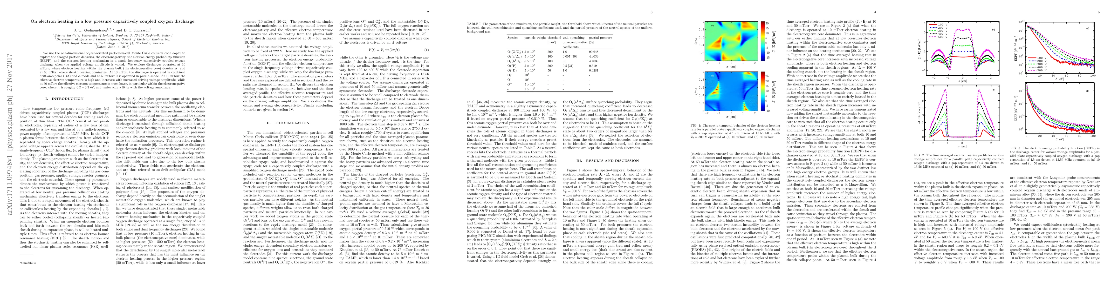 This study investigates electron heating mechanisms in low-pressure oxygen discharges using a particle-in-cell Monte Carlo code, finding that at 10 mTorr, electron heating in the plasma bulk is dominant and increases with voltage, while at 50 mTorr, sheath heating prevails and electron temperature remains low.