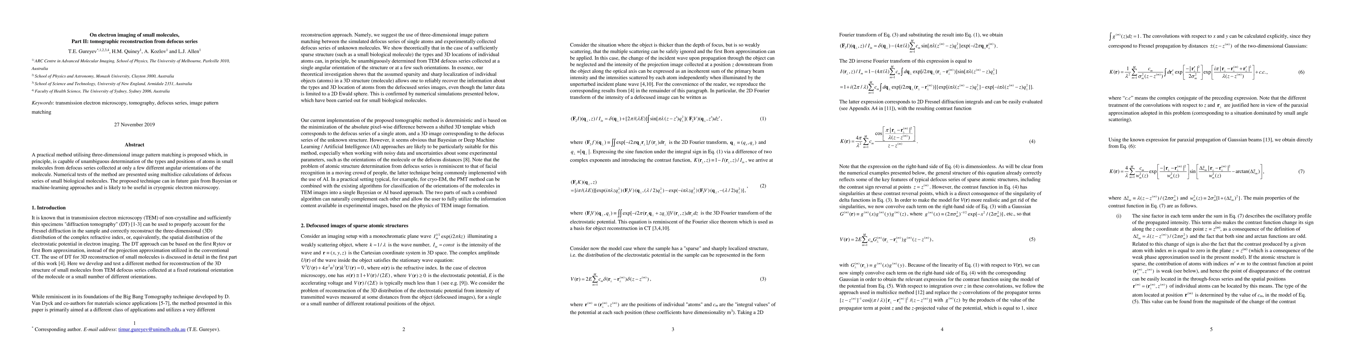 A practical method utilising three-dimensional image pattern matching is proposed which, in principle, is capable of unambiguous determination of the types and positions of atoms in small molecules from defocus series collected at only a few different angular orientations of the molecule. Numerical tests of the method are presented using multislice calculations of defocus series of small biological molecules. The proposed technique can in future gain from Bayesian or machine-learning approaches and is likely to be useful in cryogenic electron microscopy.