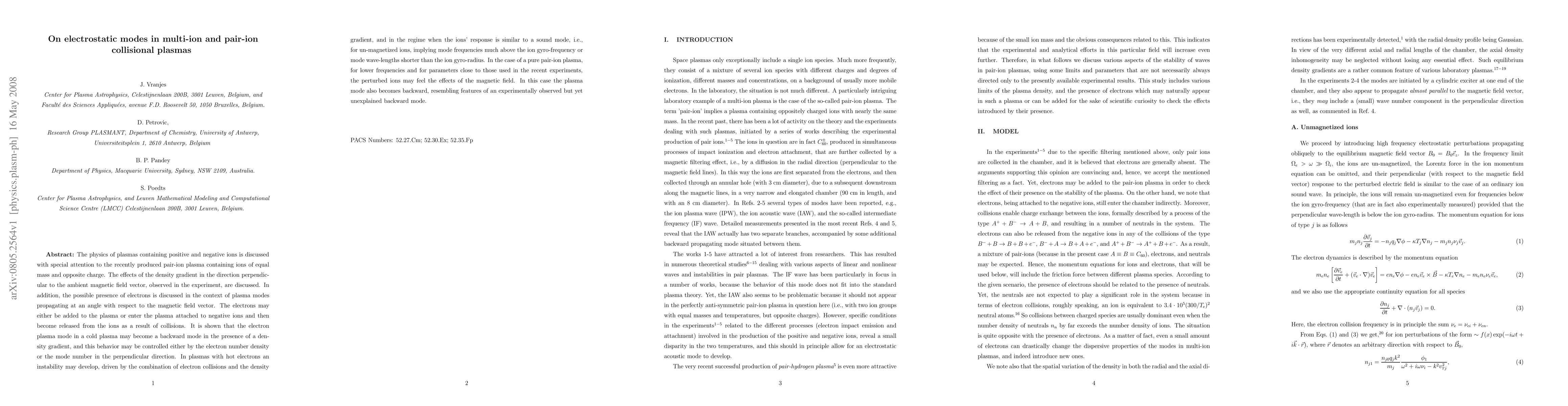 The physics of plasmas containing positive and negative ions is discussed with special attention to the recently produced pair-ion plasma containing ions of equal mass and opposite charge. The effects of the density gradient in the direction perpendicular to the ambient magnetic field vector, observed in the experiment, are discussed. In addition, the possible presence of electrons is discussed in the context of plasma modes propagating at an angle with respect to the magnetic field vector. The electrons may either be added to the plasma or enter the plasma attached to negative ions and then become released from the ions as a result of collisions. It is shown that the electron plasma mode in a cold plasma may become a backward mode in the presence of a density gradient, and this behavior may be controlled either by the electron number density or the mode number in the perpendicular direction. In plasmas with hot electrons an instability may develop, driven by the combination of electron collisions and the density gradient, and in the regime when the ions' response is similar to a sound mode, i.e., for un-magnetized ions, implying mode frequencies much above the ion gyro-frequency or mode wave-lengths shorter than the ion gyro-radius. In the case of a pure pair-ion plasma, for lower frequencies and for parameters close to those used in the recent experiments, the perturbed ions may feel the effects of the magnetic field. In this case the plasma mode also becomes backward, resembling features of an experimentally observed but yet unexplained backward mode.