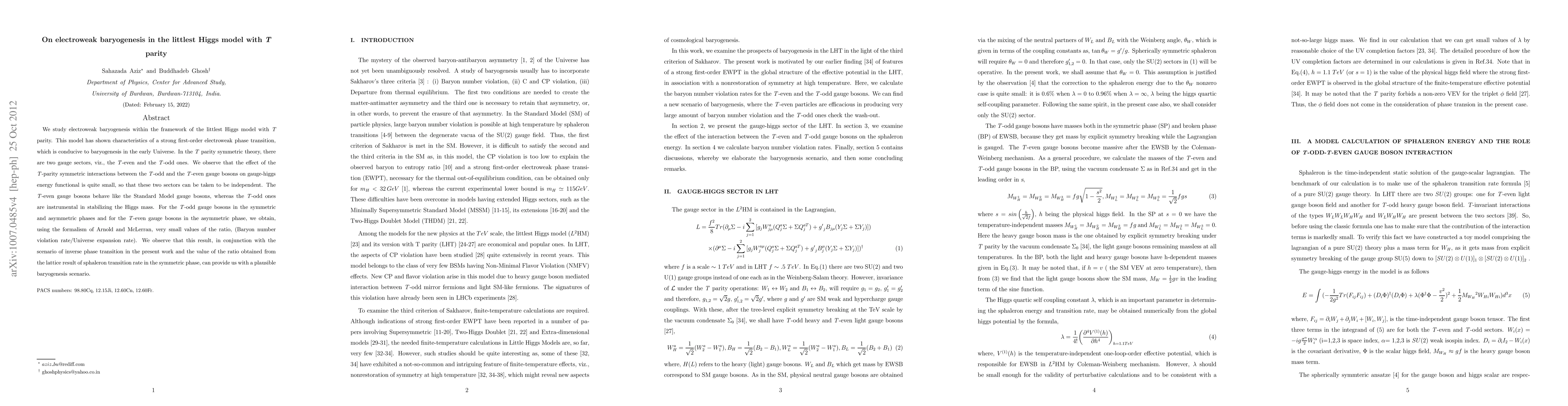 Researchers study electroweak baryogenesis in a modified Higgs model with T parity, finding that it provides a plausible scenario for the origin of matter in the early Universe.