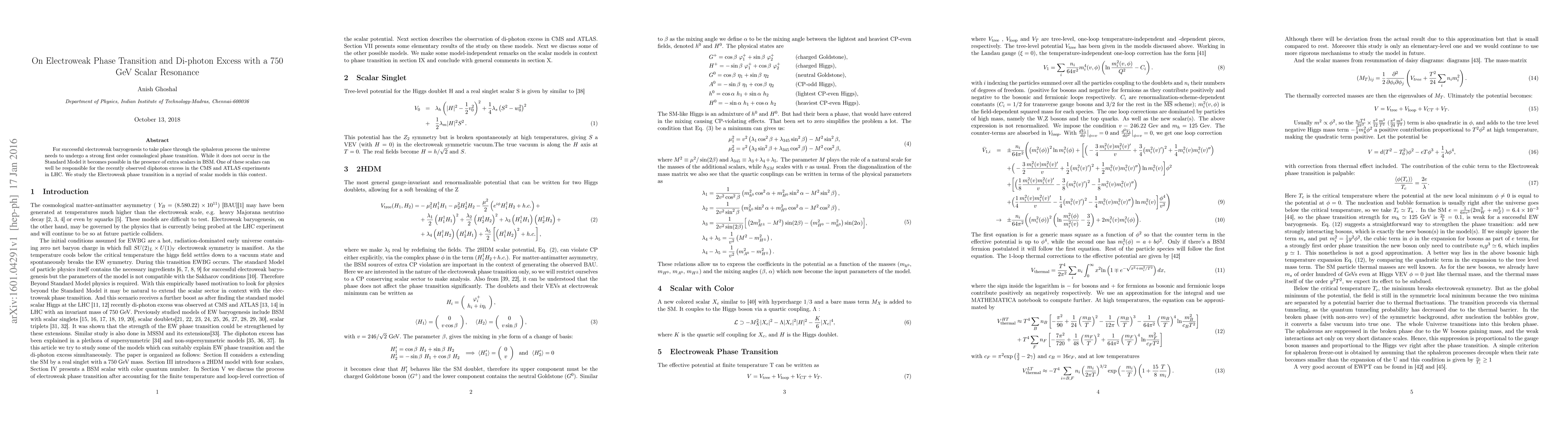 This paper investigates the potential for a strong first-order electroweak phase transition in the context of Beyond Standard Model (BSM) scalars, which could facilitate successful electroweak baryogenesis. It also explores the possibility that a 750 GeV scalar resonance could be responsible for the observed diphoton excess in LHC experiments.