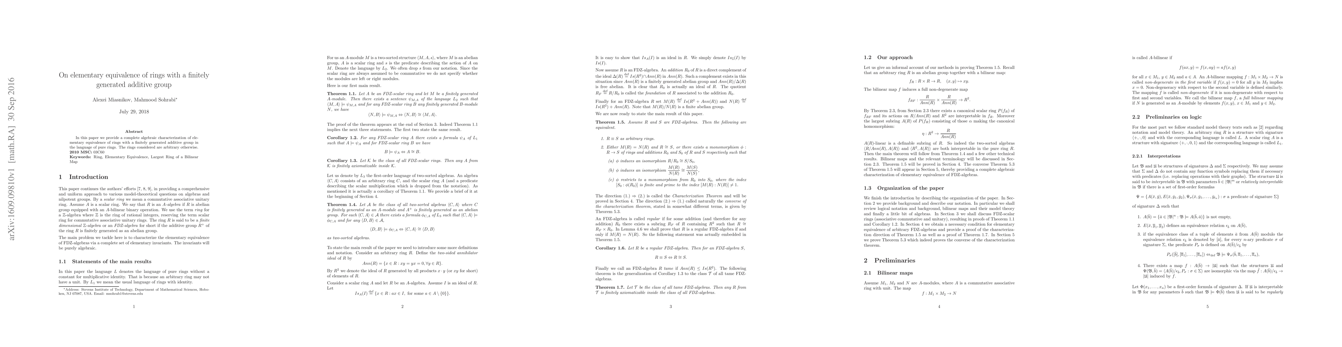 Researchers provide an algebraic characterization of elementary equivalence for rings with a finitely generated additive group, offering a key insight into ring structures.