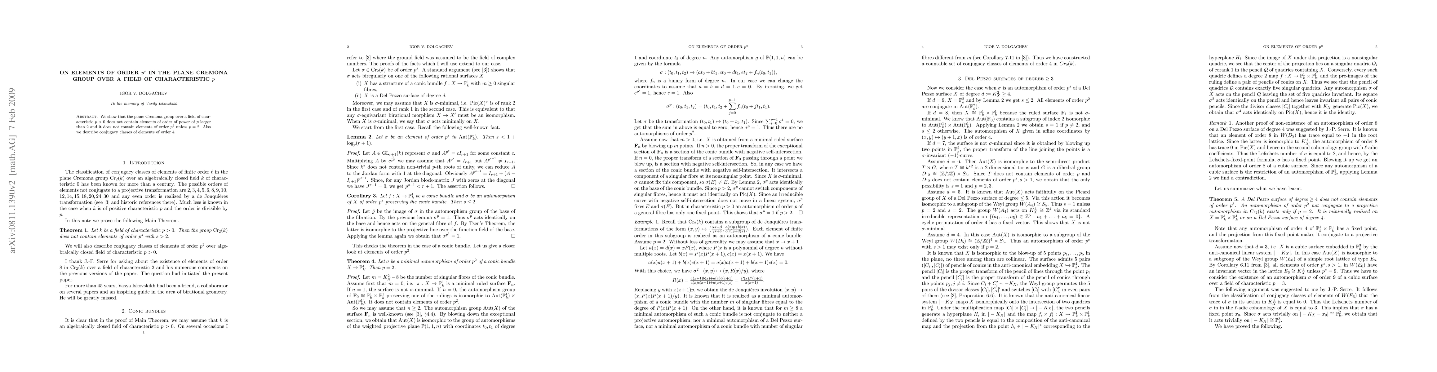 Summary: The paper demonstrates that the plane Cremona group over a field with characteristic p does not contain elements of order greater than p^2 unless p equals 2, and describes the conjugacy classes of elements of order 4.