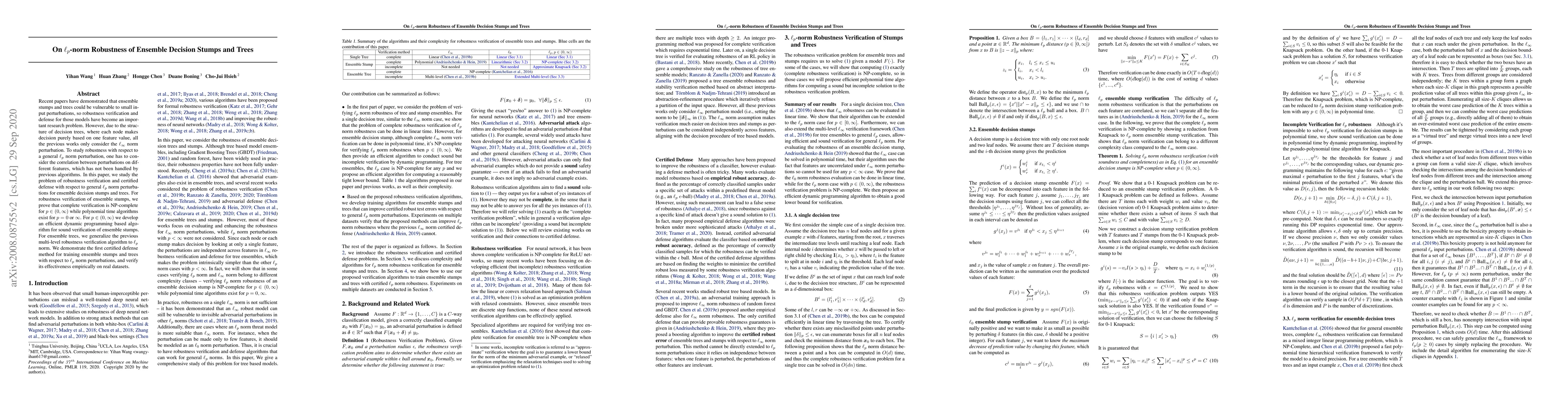 This paper investigates the $\ell_p$-norm robustness of ensemble decision stumps and trees, addressing the limitations of previous $\ell_\infty$ norm-based approaches. It develops efficient algorithms for verifying robustness and presents the first certified defense method for training these models against general $\ell_p$ norm perturbations, demonstrating effectiveness on real datasets.