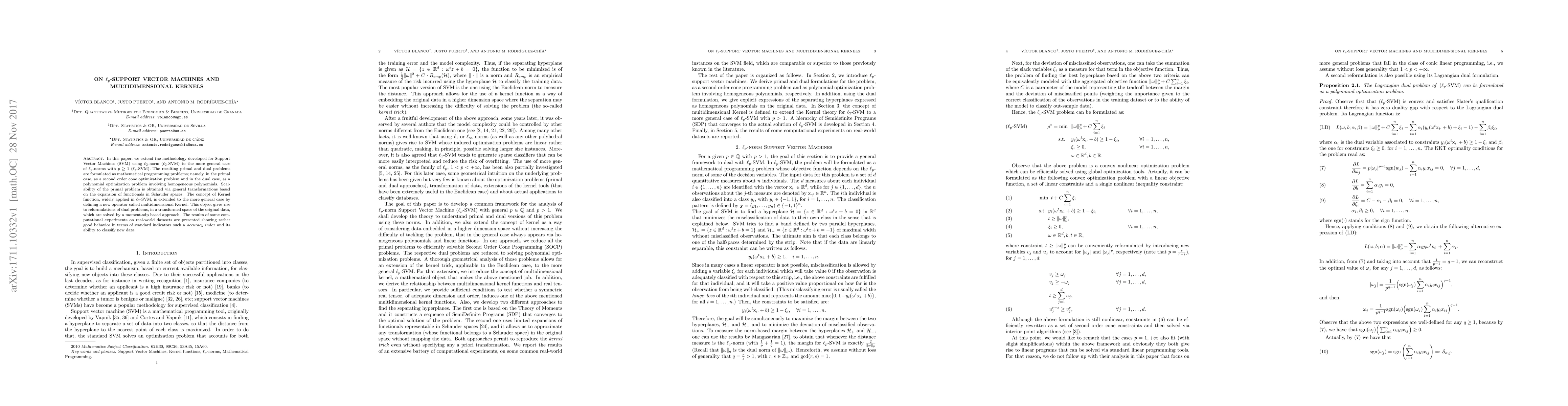 In this paper, we extend the methodology developed for Support Vector Machines (SVM) using $\ell_2$-norm ($\ell_2$-SVM) to the more general case of $\ell_p$-norms with $p\ge 1$ ($\ell_p$-SVM). The resulting primal and dual problems are formulated as mathematical programming problems; namely, in the primal case, as a second order cone optimization problem and in the dual case, as a polynomial optimization problem involving homogeneous polynomials. Scalability of the primal problem is obtained via general transformations based on the expansion of functionals in Schauder spaces. The concept of Kernel function, widely applied in $\ell_2$-SVM, is extended to the more general case by defining a new operator called multidimensional Kernel. This object gives rise to reformulations of dual problems, in a transformed space of the original data, which are solved by a moment-sdp based approach. The results of some computational experiments on real-world datasets are presented showing rather good behavior in terms of standard indicators such a \textit{accuracy index} and its ability to classify new data.