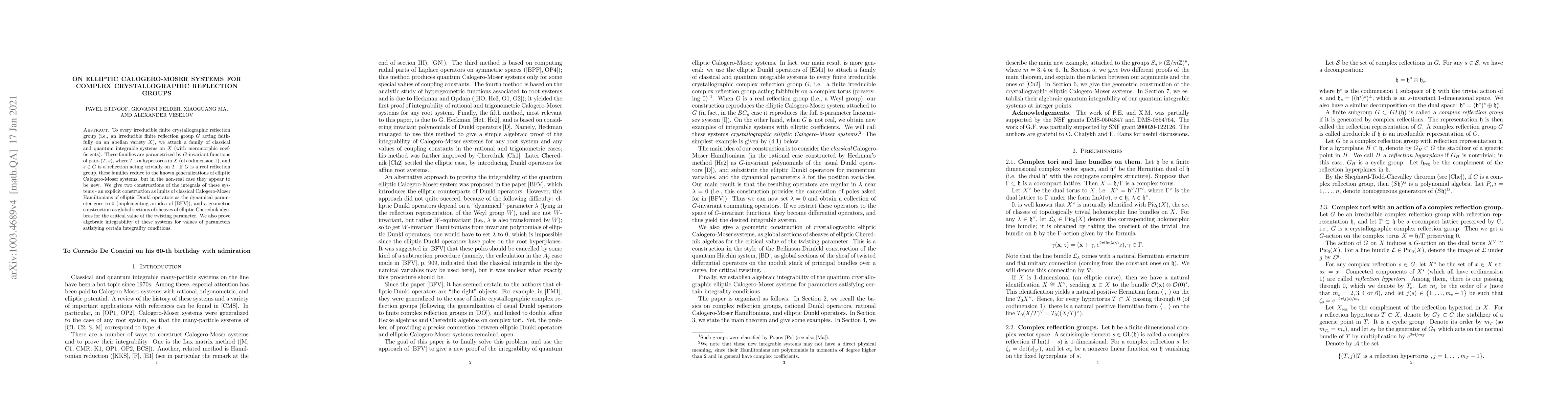 This paper constructs families of classical and quantum integrable systems associated with irreducible finite crystallographic reflection groups, generalizing elliptic Calogero-Moser systems. The systems are shown to be algebraic and integrable under specific parameter conditions, with two distinct constructions provided.