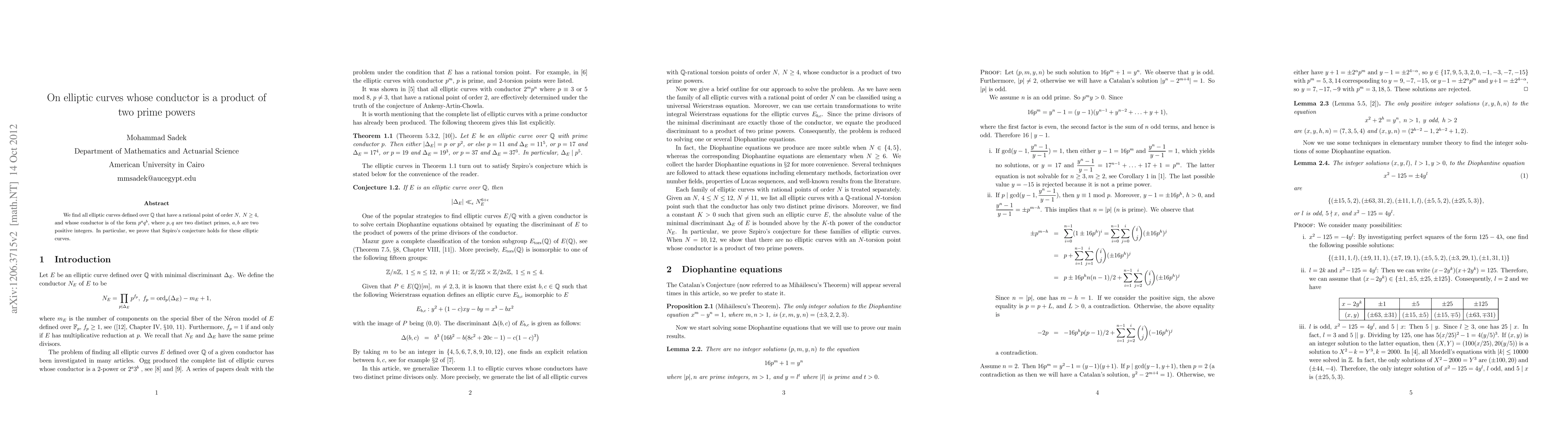 We find all elliptic curves defined over $\mathbb{Q}$ that have a rational point of order $N$, $N\ge 4$, and whose conductor is of the form $p^aq^b$, where p, q are two distinct primes, a, b are two positive integers. In particular, we prove that Szpiro's conjecture holds for these elliptic curves.