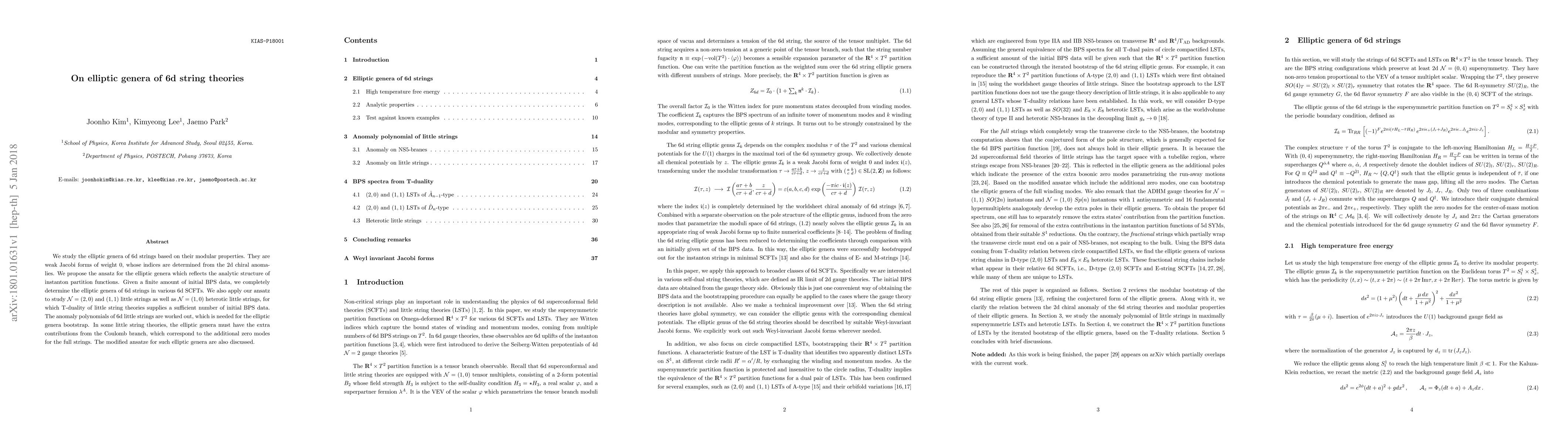 We study the elliptic genera of 6d strings based on their modular properties. They are weak Jacobi forms of weight 0, whose indices are determined from the 2d chiral anomalies. We propose the ansatz for the elliptic genera which reflects the analytic structure of instanton partition functions. Given a finite amount of initial BPS data, we completely determine the elliptic genera of 6d strings in various 6d SCFTs. We also apply our ansatz to study $\mathcal{N}=(2,0)$ and $(1,1)$ little strings as well as $\mathcal{N}=(1,0)$ heterotic little strings, for which T-duality of little string theories supplies a sufficient number of initial BPS data. The anomaly polynomials of 6d little strings are worked out, which is needed for the elliptic genera bootstrap. In some little string theories, the elliptic genera must have the extra contributions from the Coulomb branch, which correspond to the additional zero modes for the full strings. The modified ansatze for such elliptic genera are also discussed.