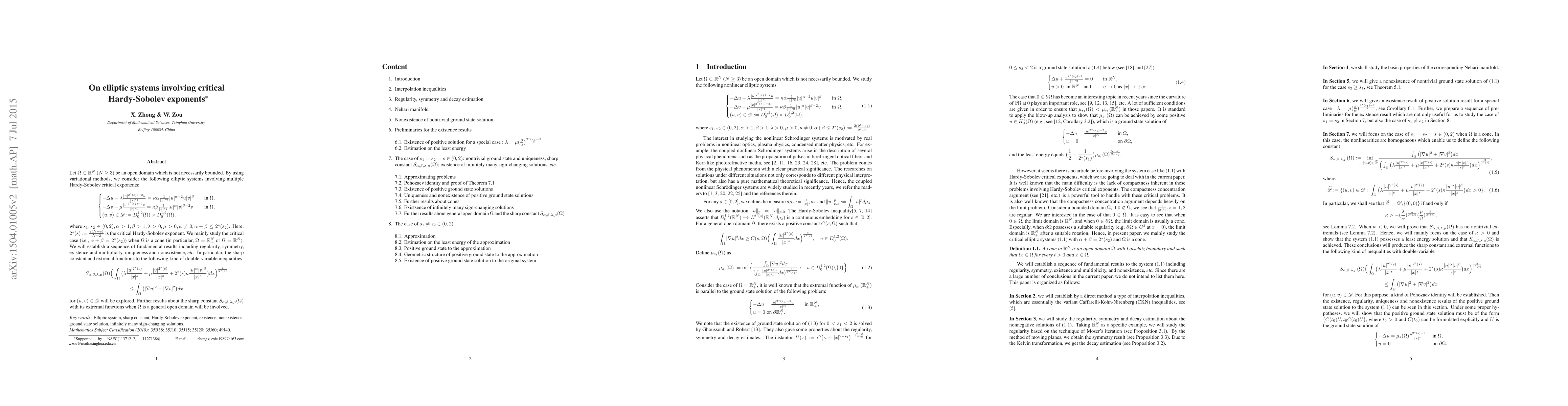 This paper investigates elliptic systems with critical Hardy-Sobolev exponents using variational methods, focusing on the critical case when $\alpha+\beta=2^*(s_2)$. It explores regularity, symmetry, existence, multiplicity, and sharp constants for associated double-variable inequalities in various domains, particularly cones.