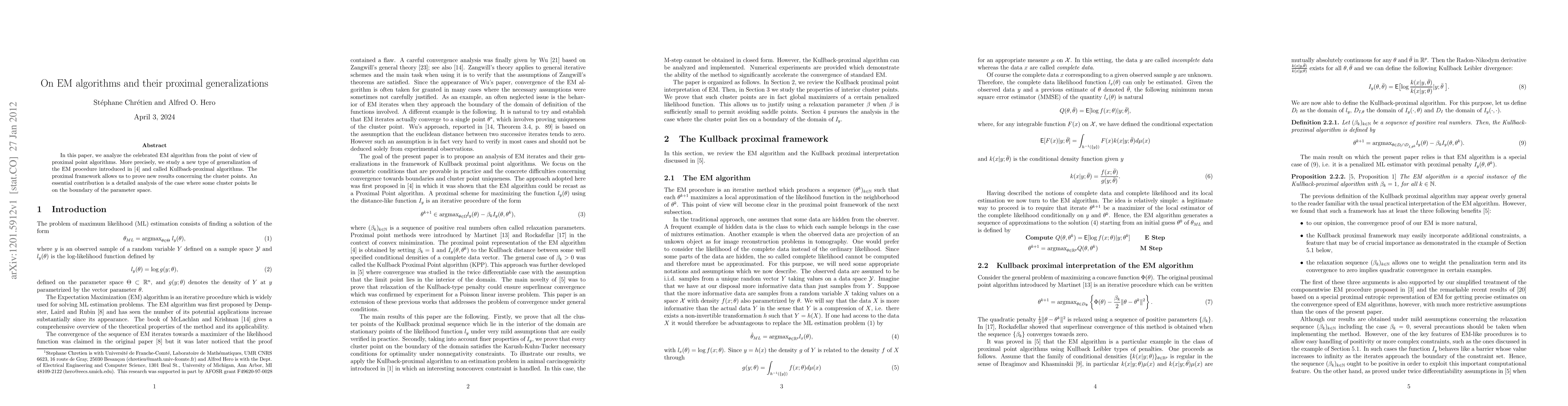 In this paper, we analyze the celebrated EM algorithm from the point of view of proximal point algorithms. More precisely, we study a new type of generalization of the EM procedure introduced in \cite{Chretien&Hero:98} and called Kullback-proximal algorithms. The proximal framework allows us to prove new results concerning the cluster points. An essential contribution is a detailed analysis of the case where some cluster points lie on the boundary of the parameter space.