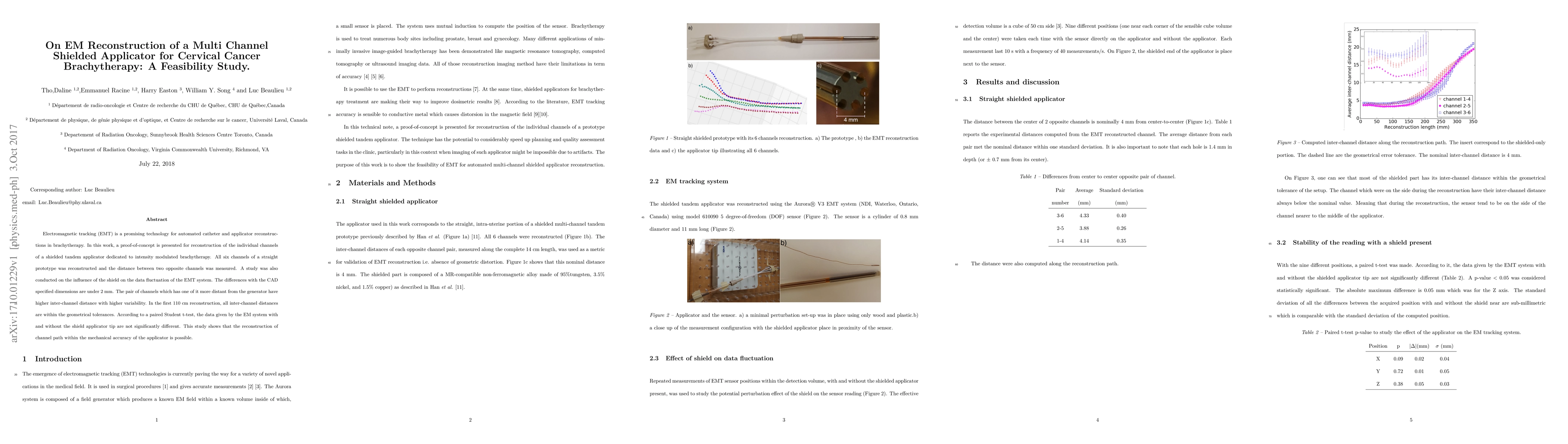 Electromagnetic tracking (EMT) is a promising technology for automated catheter and applicator reconstruc- 10 tions in brachytherapy. In this work, a proof-of-concept is presented for reconstruction of the individual channels of a shielded tandem applicator dedicated to intensity modulated brachytherapy. All six channels of a straight prototype was reconstructed and the distance between two opposite channels was measured. A study was also conducted on the influence of the shield on the data fluctuation of the EMT system. The differences with the CAD specified dimensions are under 2 mm. The pair of channels which has one of it more distant from the generator have 15 higher inter-channel distance with higher variability. In the first 110 cm reconstruction, all inter-channel distances are within the geometrical tolerances. According to a paired Student t-test, the data given by the EM system with and without the shield applicator tip are not significantly different. This study shows that the reconstruction of channel path within the mechanical accuracy of the applicator is possible.