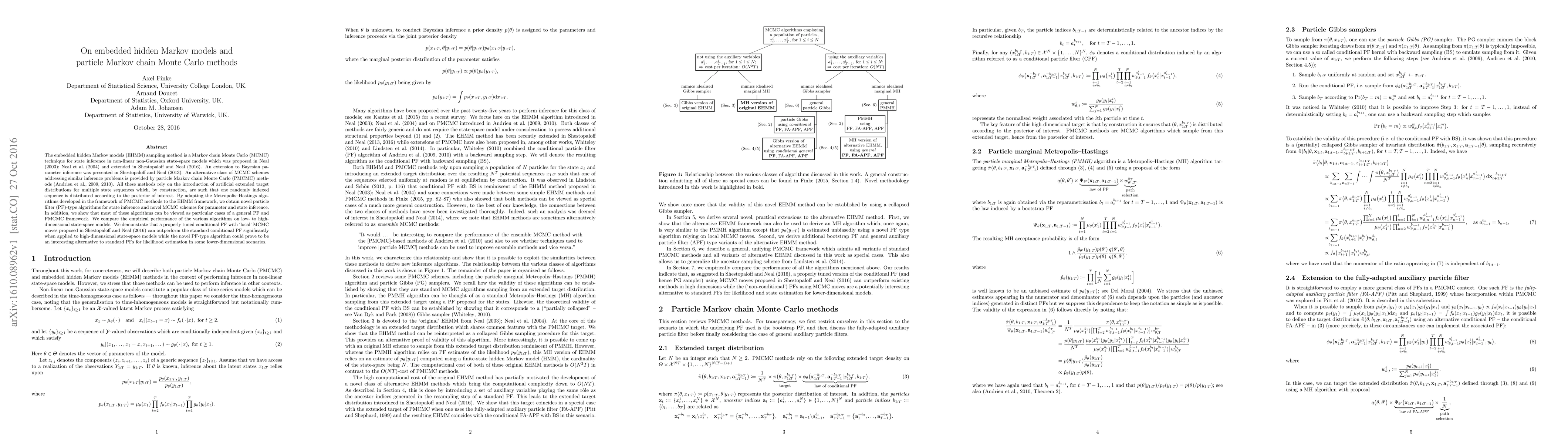 The embedded hidden Markov model (EHMM) sampling method is a Markov chain Monte Carlo (MCMC) technique for state inference in non-linear non-Gaussian state-space models which was proposed in Neal (2003); Neal et al. (2004) and extended in Shestopaloff and Neal (2016). An extension to Bayesian parameter inference was presented in Shestopaloff and Neal (2013). An alternative class of MCMC schemes addressing similar inference problems is provided by particle MCMC (PMCMC) methods (Andrieu et al. 2009; 2010). All these methods rely on the introduction of artificial extended target distributions for multiple state sequences which, by construction, are such that one randomly indexed sequence is distributed according to the posterior of interest. By adapting the Metropolis-Hastings algorithms developed in the framework of PMCMC methods to the EHMM framework, we obtain novel particle filter (PF)-type algorithms for state inference and novel MCMC schemes for parameter and state inference. In addition, we show that most of these algorithms can be viewed as particular cases of a general PF and PMCMC framework. We compare the empirical performance of the various algorithms on low- to high-dimensional state-space models. We demonstrate that a properly tuned conditional PF with "local" MCMC moves proposed in Shestopaloff and Neal (2016) can outperform the standard conditional PF significantly when applied to high-dimensional state-space models while the novel PF-type algorithm could prove to be an interesting alternative to standard PFs for likelihood estimation in some lower-dimensional scenarios.