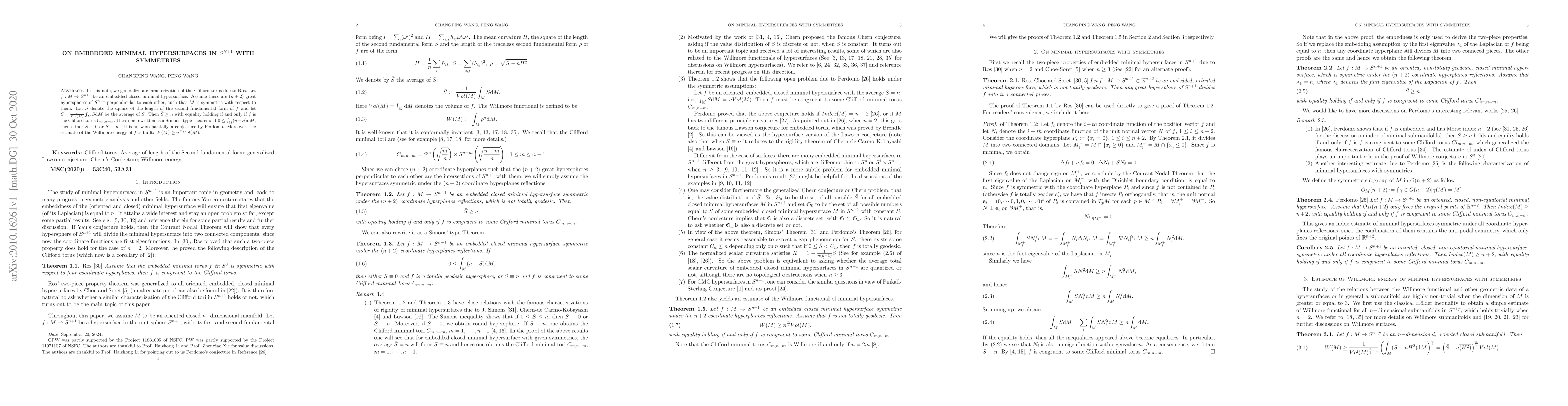 A new theorem states that for embedded minimal hypersurfaces in $S^{n+1}$ with symmetries, the average of their second fundamental form squared is greater than or equal to n, with equality if and only if the surface is a Clifford torus. The result also implies an estimate for the Willmore energy of the surface.