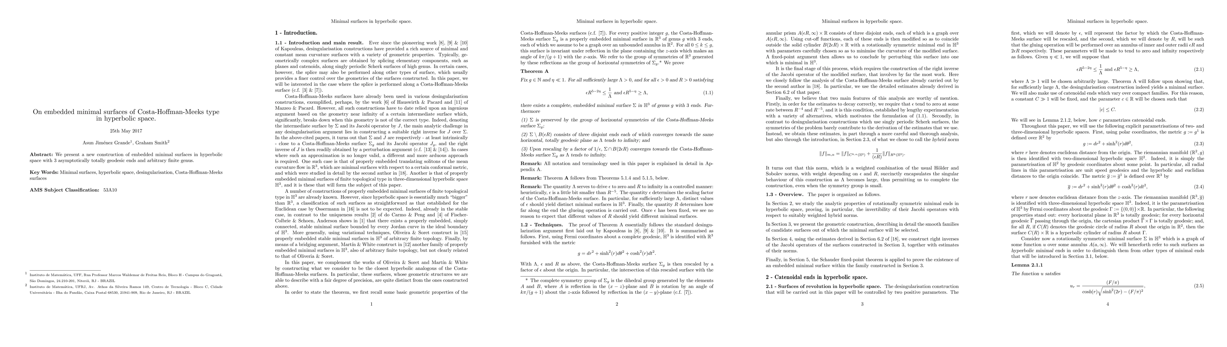 Summary: This paper introduces a novel construction method for embedded minimal surfaces in hyperbolic space, featuring three asymptotically totally geodesic ends and supporting surfaces of any finite genus. The method provides new insights into the geometry of minimal surfaces in hyperbolic environments.