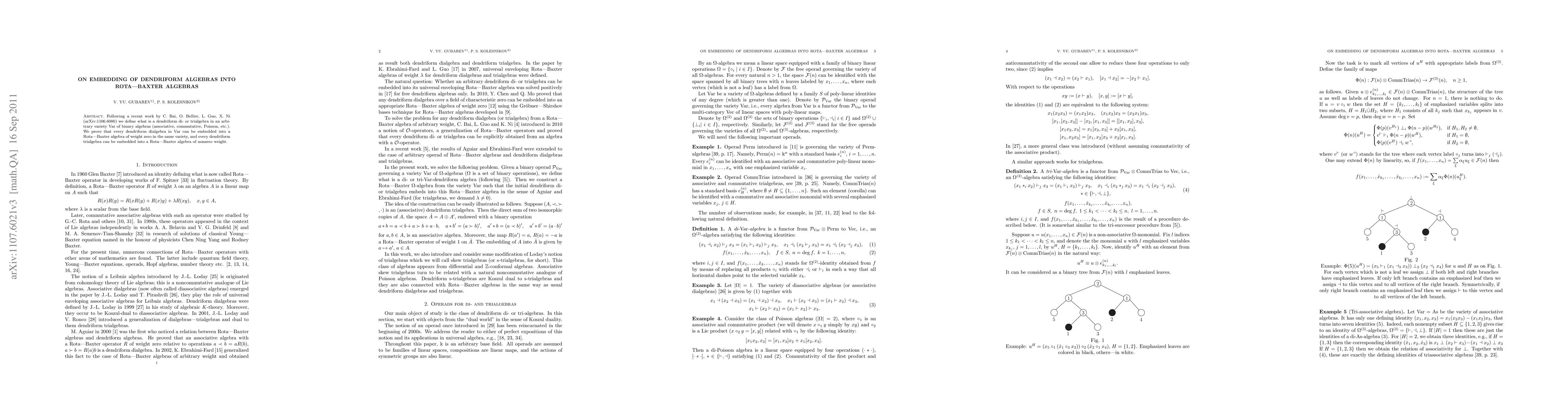 Following a recent work by C. Bai, O. Bellier, L. Guo, and X. Ni (arXiv:1106.6080) we define what is a dendriform di- or trialgebra in an arbitrary variety Var of algebras (associative, commutative, Poisson, etc.). We prove that every dendriform dialgebra in Var can be embedded into a Rota---Baxter algebra of weight zero in the same variety, and every dendriform trialgebra can be embedded into a Rota---Baxter algebra of nonzero weight.