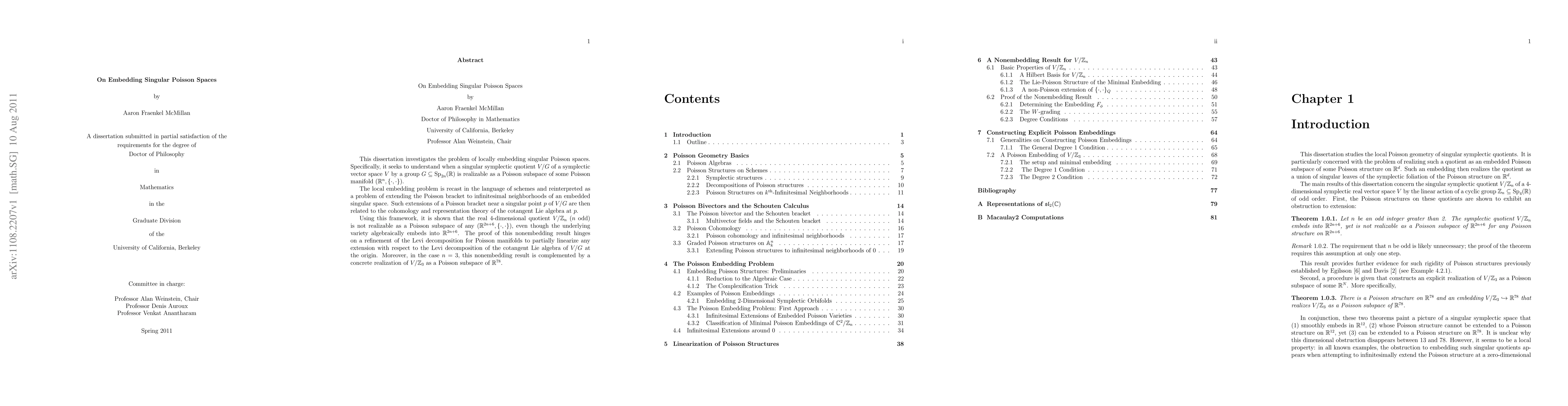 This dissertation investigates the problem of locally embedding singular Poisson spaces. Specifically, it seeks to understand when a singular symplectic quotient V/G of a symplectic vector space V by a group G \subseteq Sp_2n(R) is realizable as a Poisson subspace of some Poisson manifold (R^n,{.,.}). The local embedding problem is recast in the language of schemes and reinterpreted as a problem of extending the Poisson bracket to infinitesimal neighborhoods of an embedded singular space. Such extensions of a Poisson bracket near a singular point p of V/G are then related to the cohomology and representation theory of the cotangent Lie algebra at p. Using this framework, it is shown that the real 4-dimensional quotient V/\ZZ_n (n odd) is not realizable as a Poisson subspace of any (R^{2n+6},{.,.}), even though the underlying variety algebraically embeds into R^{2n+6}. The proof of this nonembedding result hinges on a refinement of the Levi decomposition for Poisson manifolds to partially linearize any extension with respect to the Levi decomposition of the cotangent Lie algebra of V/G at the origin. Moreover, in the case n=3, this nonembedding result is complemented by a concrete realization of V/\ZZ_3 as a Poisson subspace of R^78.