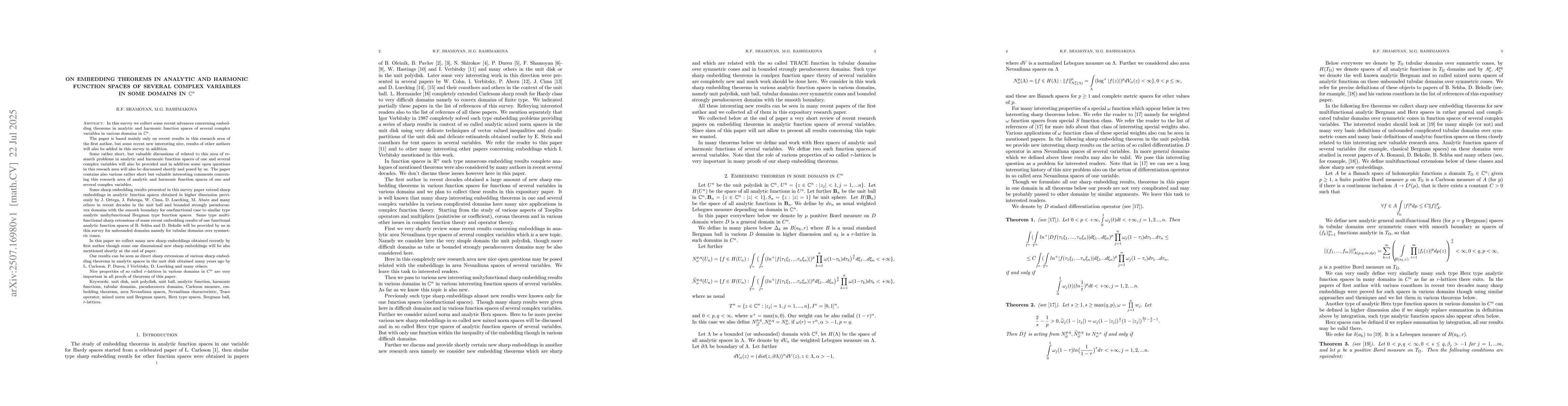 In this survey we collect some recent advances concerning embedding theorems in analytic and harmonic function spaces of several complex variables in various domains in $C^n$. The paper is based mainly only on recent results in this research area of the first author, but some recent new interesting nice, results of other authors will also be added in this survey in addition. Some rather short, but valuable discussions of related to this area of research problems in analytic and harmonic function spaces of one and several complex variables will also be provided and in addition some open questions in this reseach area will also be discusssed shortly and posed by us. The paper contains also various rather short but valuable interesting comments concerning this research area of analytic and harmonic function spaces of one and several complex variables. Some sharp embedding results presented in this survey paper extend sharp embeddings in analytic function spaces obtained in higher dimension previously by J. Ortega, J. Fabrega, W. Cima, D. Luecking, M. Abate and many others in recent decades in the unit ball and bounded strongly pseudoconvex domains with the smooth boundary for onefunctional case to similar type analytic multyfunctional Bergman type function spaces. Same type multifunctional sharp extensions of some recent embedding results of one functional analytic function spaces of B. Sehba and D. Bekolle will be provided by us in this survey for unbounded domains namely for tubular domains over symmetric cones. In this paper we collect many new sharp embeddings obtained recently by first author though some one dimensional new sharp embeddings will be also mentioned shortly at the end of paper.
