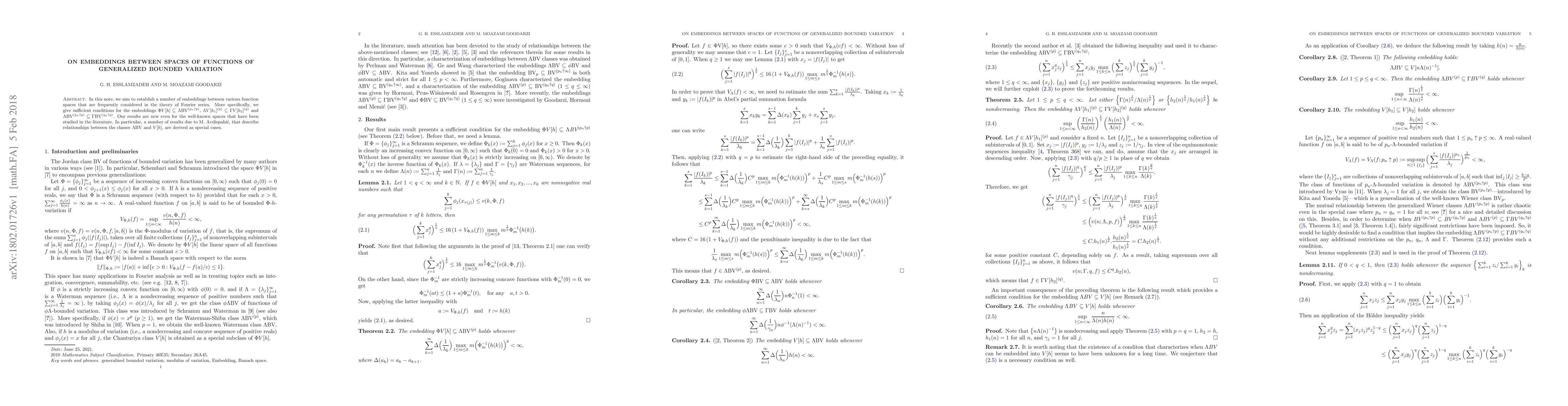 This paper establishes new embeddings between various function spaces related to generalized bounded variation, including $\Phi V[h]\subseteq \Lambda\text{BV}^{(p_n\uparrow p)}$, $\Lambda V[h_1]^{(p)}\subseteq\Gamma V[h_2]^{(q)}$, and $\Lambda\text{BV}^{(p_n\uparrow p)}\subseteq\Gamma\text{BV}^{(q_n\uparrow q)}$, with results extending even to well-known spaces previously studied by M. Avdispahić.