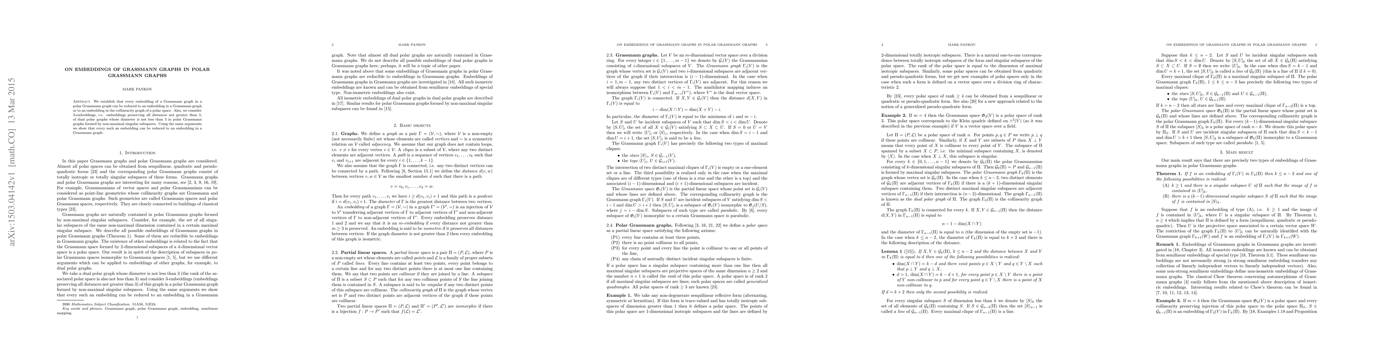 This paper demonstrates that any embedding of a Grassmann graph into a polar Grassmann graph can be simplified to an embedding in either a Grassmann graph or the collinearity graph of a polar space. It also investigates $3$-embeddings of dual polar graphs in polar Grassmann graphs, showing they reduce to embeddings in Grassmann graphs.
