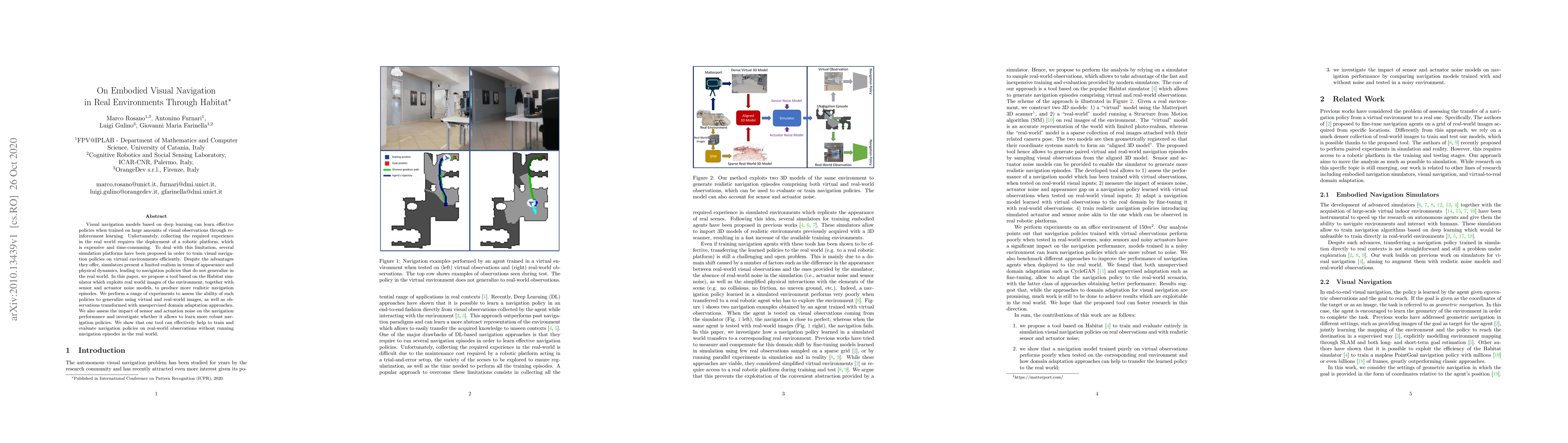 Visual navigation models based on deep learning can learn effective policies when trained on large amounts of visual observations through reinforcement learning. Unfortunately, collecting the required experience in the real world requires the deployment of a robotic platform, which is expensive and time-consuming. To deal with this limitation, several simulation platforms have been proposed in order to train visual navigation policies on virtual environments efficiently. Despite the advantages they offer, simulators present a limited realism in terms of appearance and physical dynamics, leading to navigation policies that do not generalize in the real world. In this paper, we propose a tool based on the Habitat simulator which exploits real world images of the environment, together with sensor and actuator noise models, to produce more realistic navigation episodes. We perform a range of experiments to assess the ability of such policies to generalize using virtual and real-world images, as well as observations transformed with unsupervised domain adaptation approaches. We also assess the impact of sensor and actuation noise on the navigation performance and investigate whether it allows to learn more robust navigation policies. We show that our tool can effectively help to train and evaluate navigation policies on real-world observations without running navigation pisodes in the real world.