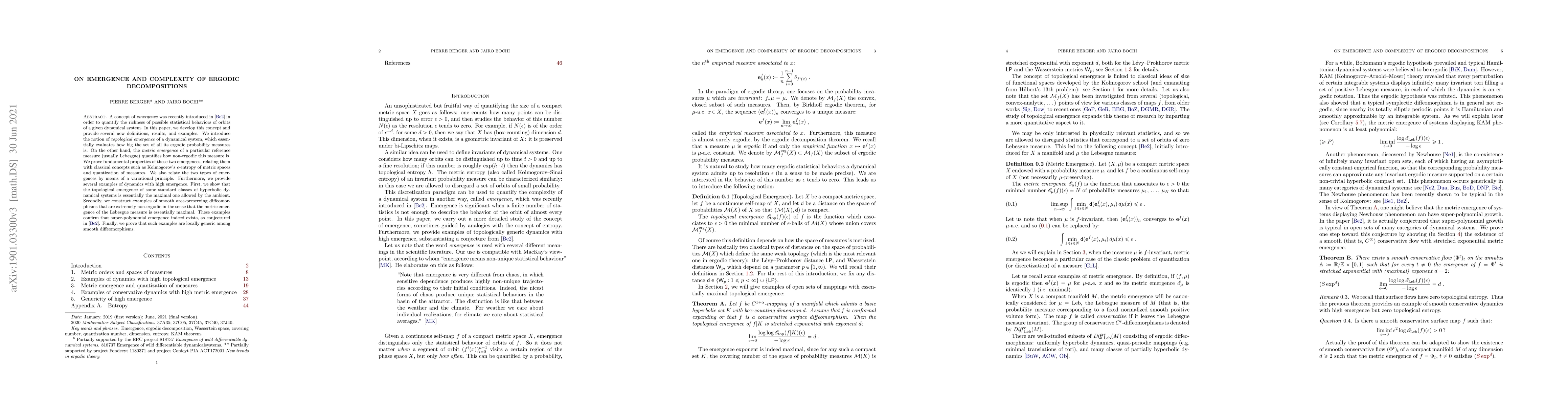 A concept of emergence was recently introduced in the paper [Berger] in order to quantify the richness of possible statistical behaviors of orbits of a given dynamical system. In this paper, we develop this concept and provide several new definitions, results, and examples. We introduce the notion of topological emergence of a dynamical system, which essentially evaluates how big the set of all its ergodic probability measures is. On the other hand, the metric emergence of a particular reference measure (usually Lebesgue) quantifies how non-ergodic this measure is. We prove fundamental properties of these two emergences, relating them with classical concepts such as Kolmogorov's $\epsilon$-entropy of metric spaces and quantization of measures. We also relate the two types of emergences by means of a variational principle. Furthermore, we provide several examples of dynamics with high emergence. First, we show that the topological emergence of some standard classes of hyperbolic dynamical systems is essentially the maximal one allowed by the ambient. Secondly, we construct examples of smooth area-preserving diffeomorphisms that are extremely non-ergodic in the sense that the metric emergence of the Lebesgue measure is essentially maximal. These examples confirm that super-polynomial emergence indeed exists, as conjectured in the paper [Berger]. Finally, we prove that such examples are locally generic among smooth diffeomorphisms.