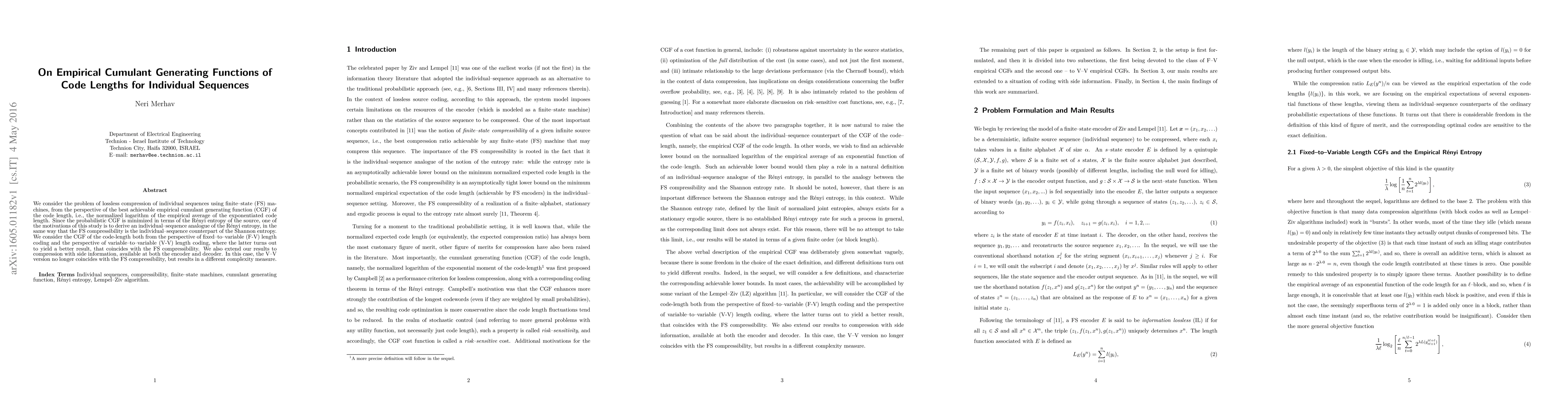 This study investigates the best achievable empirical cumulant generating function for individual sequences in lossless compression using finite-state machines, finding that variable-to-variable length coding yields a better result, coinciding with FS compressibility.