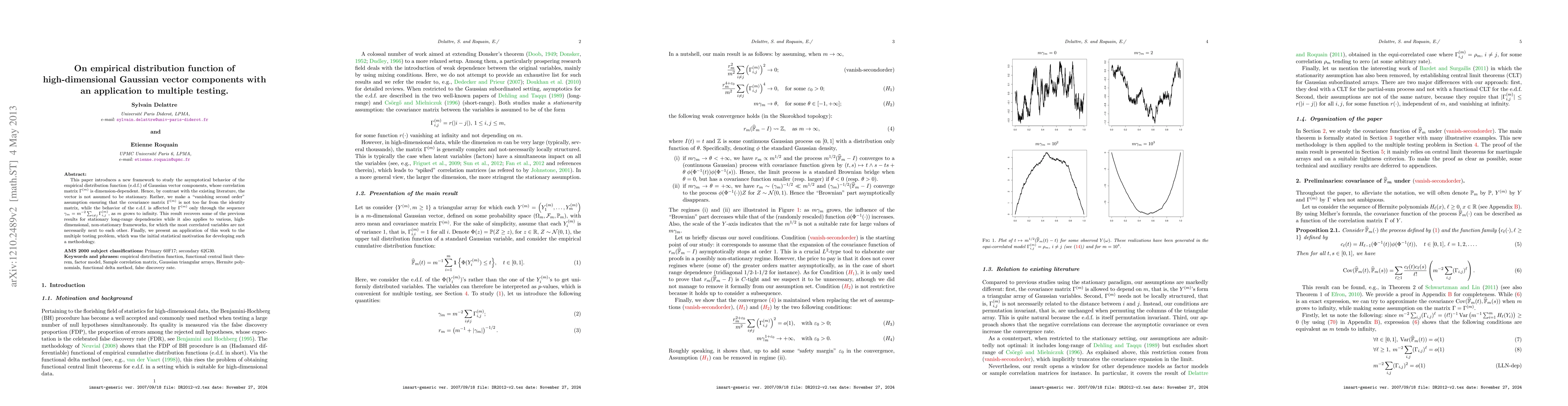 This paper introduces a new framework to study the asymptotical behavior of the empirical distribution function (e.d.f.) of Gaussian vector components, whose correlation matrix $\Gamma^{(m)}$ is dimension-dependent. Hence, by contrast with the existing literature, the vector is not assumed to be stationary. Rather, we make a "vanishing second order" assumption ensuring that the covariance matrix $\Gamma^{(m)}$ is not too far from the identity matrix, while the behavior of the e.d.f. is affected by $\Gamma^{(m)}$ only through the sequence $\gamma_m=m^{-2} \sum_{i\neq j} \Gamma_{i,j}^{(m)}$, as $m$ grows to infinity. This result recovers some of the previous results for stationary long-range dependencies while it also applies to various, high-dimensional, non-stationary frameworks, for which the most correlated variables are not necessarily next to each other. Finally, we present an application of this work to the multiple testing problem, which was the initial statistical motivation for developing such a methodology.