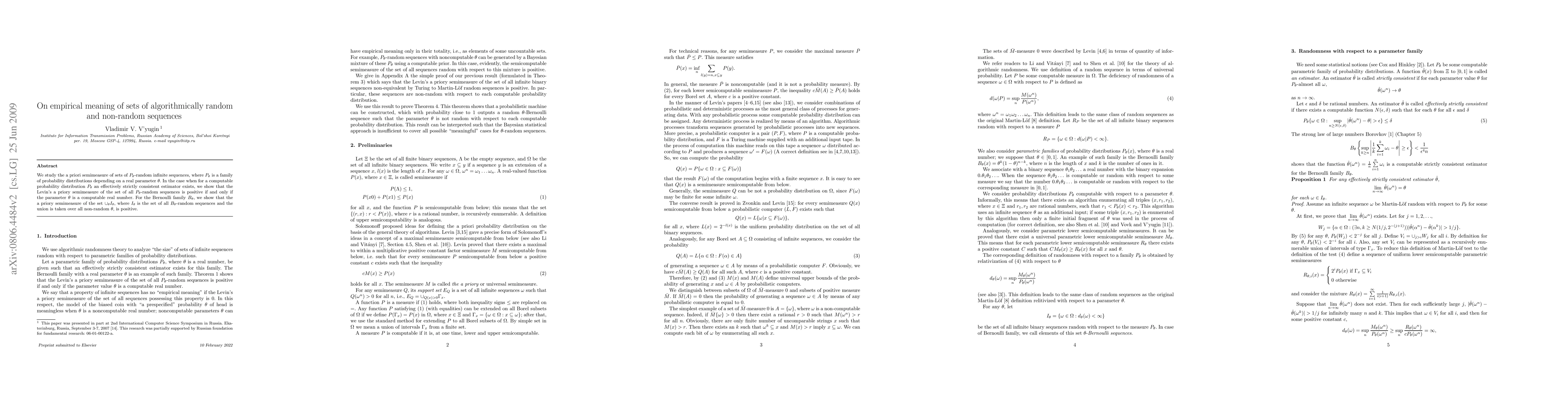 This paper explores the empirical meaning of randomness concerning a family of probability distributions parameterized by a real number $\theta$, employing algorithmic randomness theory. It demonstrates that for computable $\theta$, the Levin semimeasure of $P_\theta$-random sequences is positive, while noncomputable $\theta$ generates sequences through different, meaningful methods.