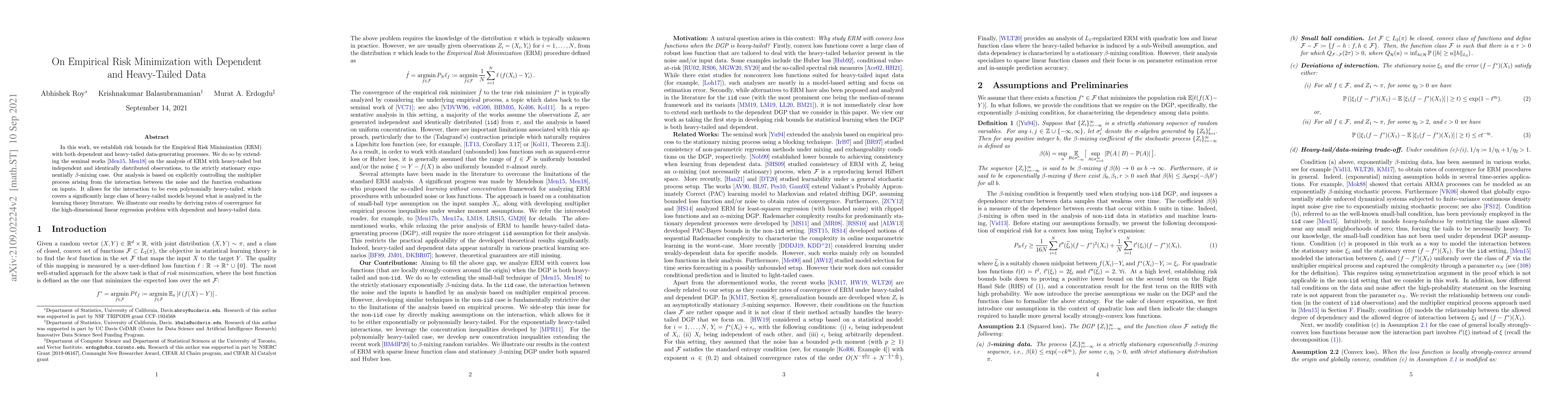 This paper extends empirical risk minimization (ERM) analysis to dependent and heavy-tailed data, generalizing Mendelson's results for independent cases. It introduces a novel method to control the multiplier process, allowing for polynomially heavy-tailed interactions, and demonstrates its effectiveness through convergence rates in high-dimensional linear regression.