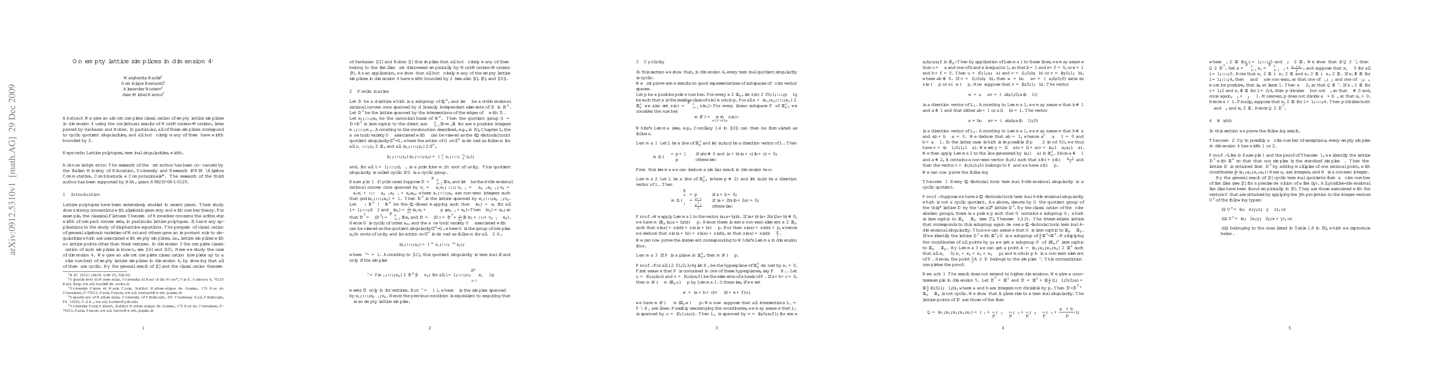 This research provides a near-complete classification of empty lattice simplices in four dimensions, demonstrating their correspondence to cyclic quotient singularities, with most having a width constraint of 2, as supported by prior conjectures and subsequent proofs.