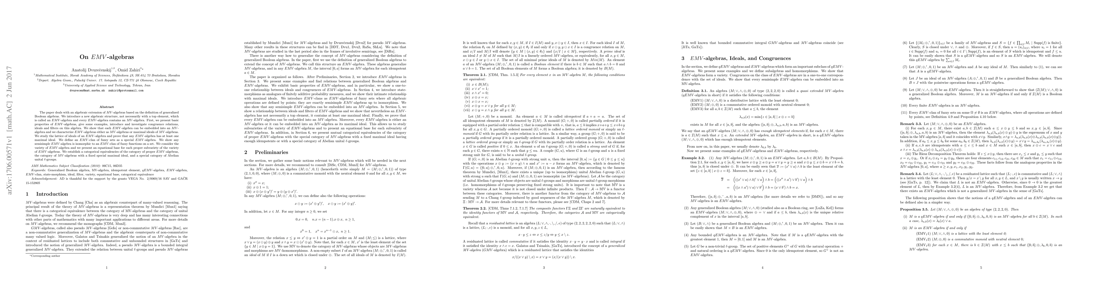 The paper introduces $EMV$-algebras, an extension of $MV$-algebras based on generalized Boolean algebras, and explores their properties, including embeddings into $MV$-algebras, congruence relations, and the lattice of ideals. It also establishes categorical equivalences and provides an equational base for proper subvarieties.