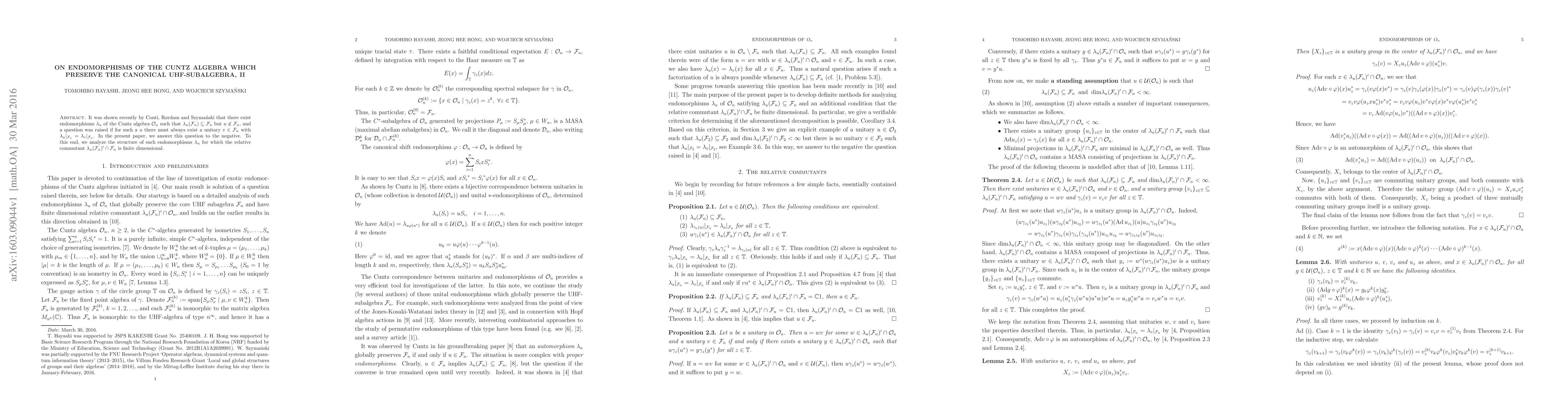 It was shown recently by Conti, R{\o}rdam and Szyma\'{n}ski that there exist endomorphisms $\lambda_u$ of the Cuntz algebra $\mathcal{O}_n$ such that $\lambda_u (\mathcal{F}_n)\subseteq\mathcal{F}_n$ but $u\not\in\mathcal{F}_n$, and a question was raised if for such a $u$ there must always exist a unitary $v\in\mathcal{F}_n$ with $\lambda_u|_{\mathcal{F}_n} = \lambda_v|_{\mathcal{F}_n}$. In the present paper, we answer this question to the negative. To this end, we analyze the structure of such endomorphisms $\lambda_u$ for which the relative commutant $\lambda_u(\mathcal{F}_n)'\cap\mathcal{F}_n$ is finite dimensional.