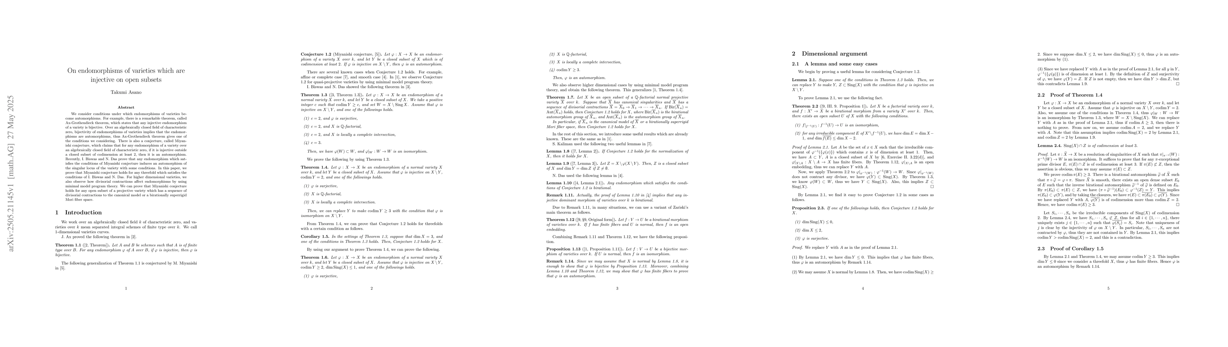 The paper employs algebraic geometry techniques, specifically examining endomorphisms of varieties and their injectivity properties, using Ax-Grothendieck theorem and Miyanishi conjecture as foundational concepts, and applying minimal model program theory for higher-dimensional varieties.