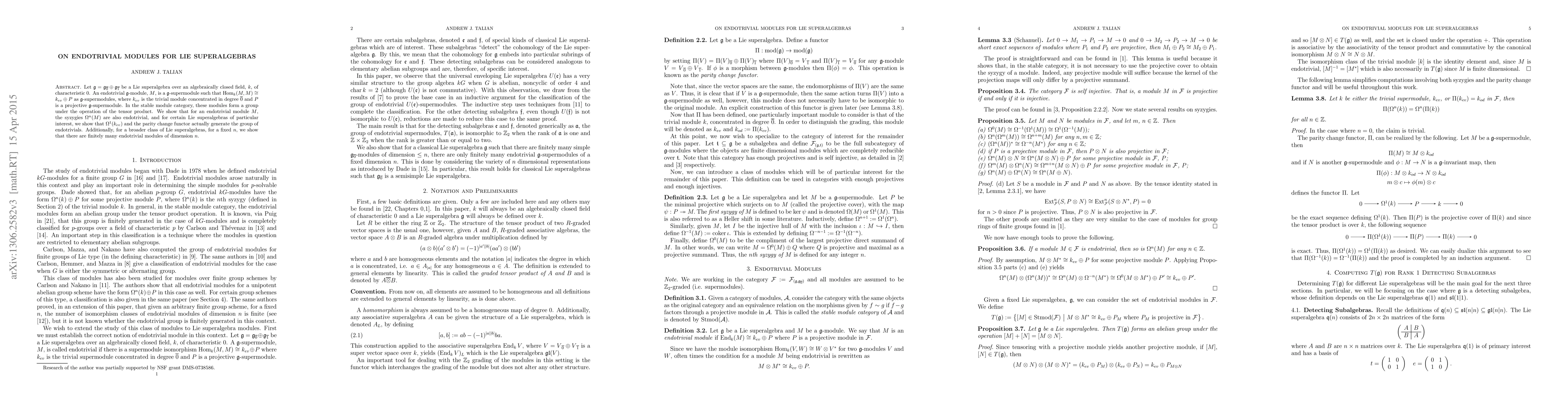 This paper investigates endotrivial modules for Lie superalgebras, showing that their syzygies are also endotrivial. It demonstrates that for specific Lie superalgebras, the first syzygy of the even trivial module and the parity change functor generate the group of endotrivials, and proves that for a broader class, there are finitely many endotrivial modules of a given dimension.