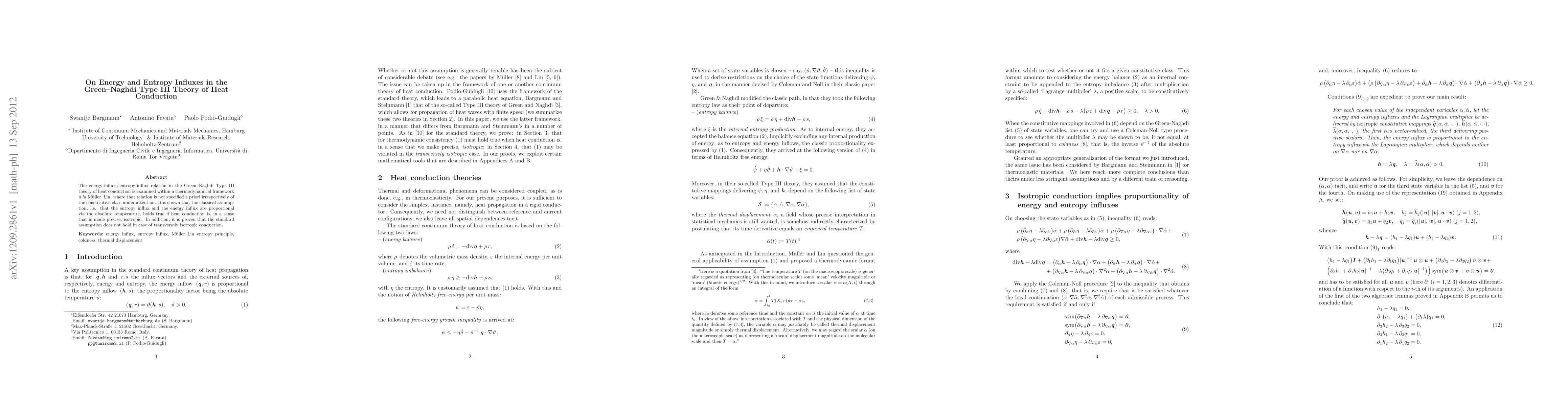 The energy-influx/entropy-influx relation in the Green-Naghdi Type III theory of heat conduction is examined within a thermodynamical framework \`a la Mueller-Liu, where that relation is not specified a priori irrespectively of the constitutive class under attention. It is shown that the classical assumption, i.e., that the entropy influx and the energy influx are proportional via the absolute temperature, holds true if heat conduction is, in a sense that is made precise, isotropic. In addition, it is proven that the standard assumption does not hold in case of transversely isotropic conduction.