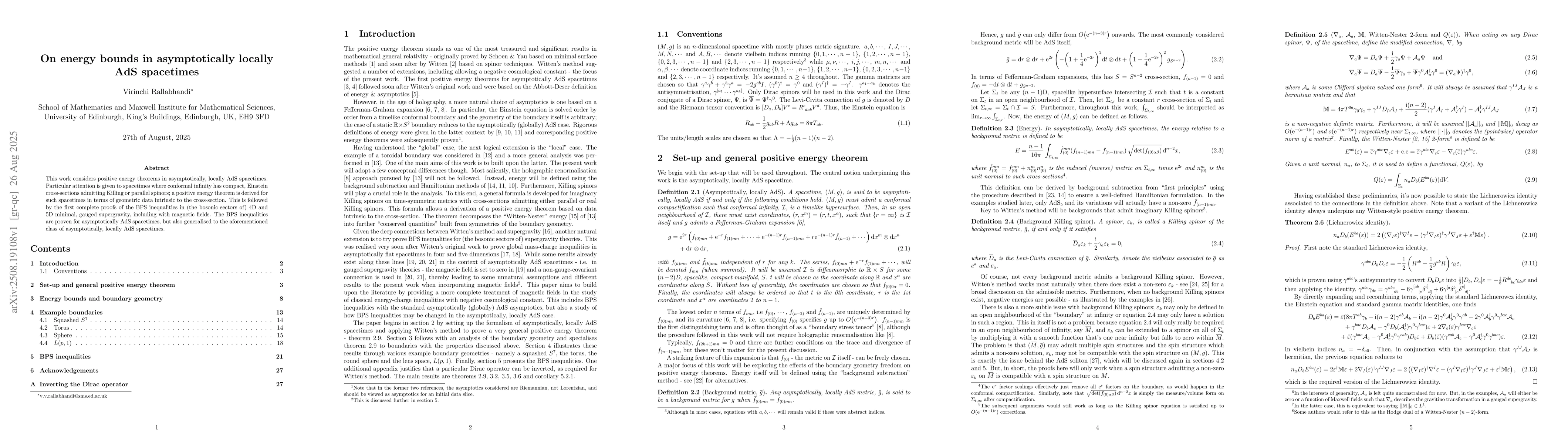This work considers positive energy theorems in asymptotically, locally AdS spacetimes. Particular attention is given to spacetimes where conformal infinity has compact, Einstein cross-sections admitting Killing or parallel spinors; a positive energy theorem is derived for such spacetimes in terms of geometric data intrinsic to the cross-section. This is followed by the first complete proofs of the BPS inequalities in (the bosonic sectors of) 4D and 5D minimal, gauged supergravity, including with magnetic fields. The BPS inequalities are proven for asymptotically AdS spacetimes, but also generalised to the aforementioned class of asymptotically, locally AdS spacetimes.
