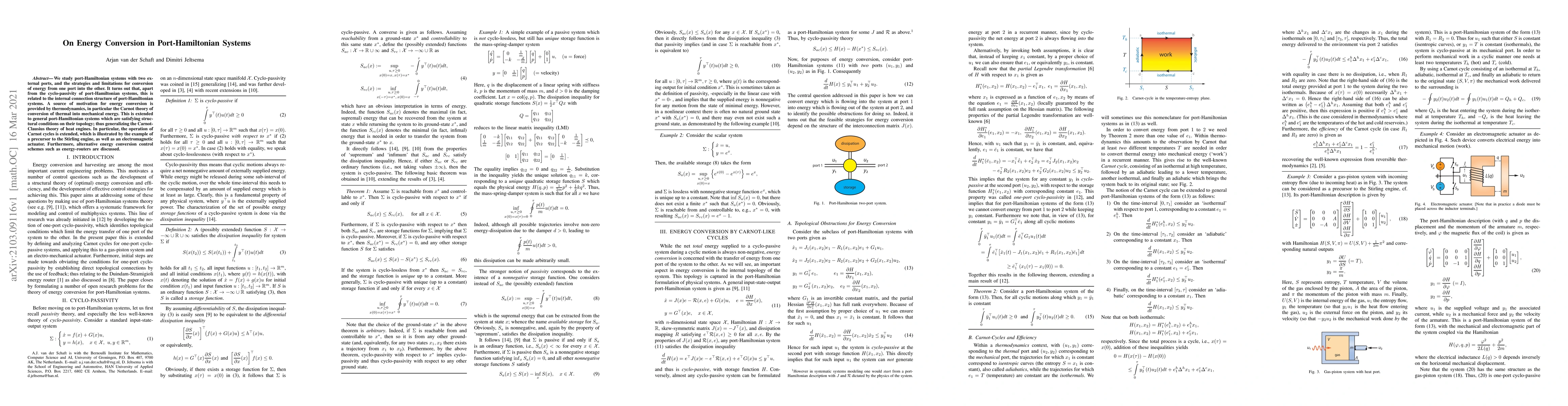 We study port-Hamiltonian systems with two external ports, and the strategies and limitations for conversion of energy from one port into the other. It turns out that, apart from the cyclo-passivity of port-Hamiltonian systems, this is related to the internal connection structure of port-Hamiltonian systems. A source of motivation for energy conversion is provided by thermodynamics, in particular the Carnot theory of conversion of thermal into mechanical energy. This is extended to general port-Hamiltonian systems which are satisfying structural conditions on their topology; thus generalizing the Carnot-Clausius theory of heat engines. In particular, the operation of Carnot cycles is extended, which is illustrated by the example of a precursor to the Stirling engine, as well as an electromagnetic actuator. Furthermore, alternative energy conversion control schemes such as energy-routers are discussed.