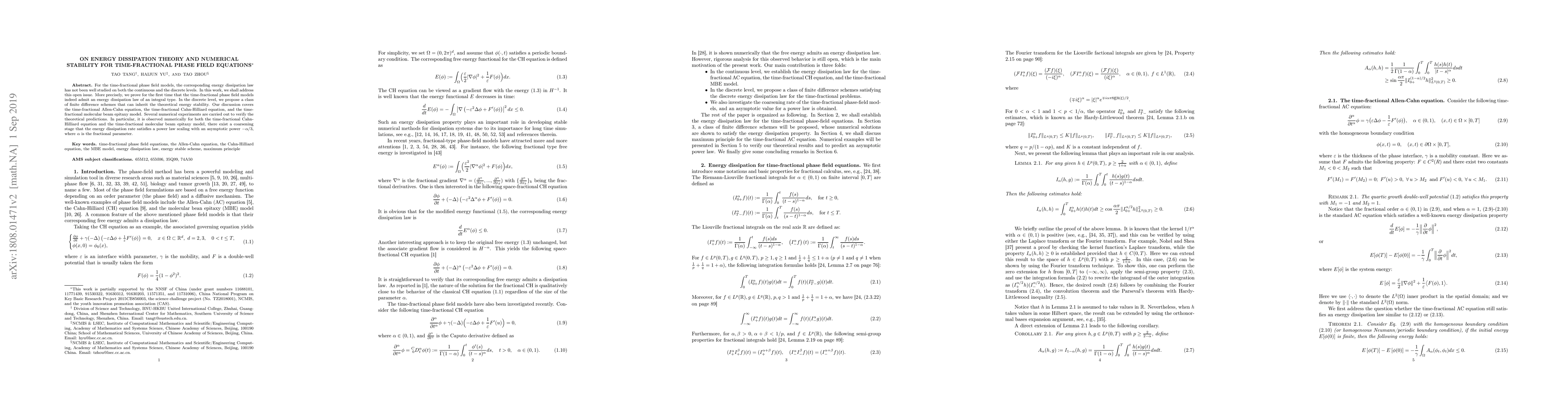 This paper establishes an integral-type energy dissipation law for time-fractional phase field models and proposes finite difference schemes that maintain theoretical energy stability. Numerical examples confirm the theoretical results and reveal multiple coarsening stages dependent on the fractional parameter.